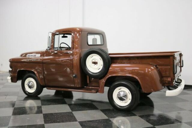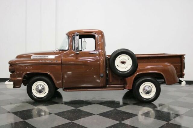 This is a lot of distinction for a very affordable price. After all, the vintage truck market is heating up with the mainstream Chevys and Fords, but when was the last time you saw a 1958 Dodge D100 pickup? With a period-correct restoration that features a bulletproof straight-six motor, a nice bronze finish, and a comfortable interior, this is the pickup that can easily steal the show for far less than others paid for their run-of-the-mill pickups. 1958... was the second year for the D100 trucks (which signified a half-ton truck within what is technically the Dodge C-series of pickups between '54-'60), and the first year of the dual headlight set-up, so 60 years later, these are worth it for the rarity alone. But that's not what really attracted you. These pickups were incredibly stylish thanks to Chrysler's "Forward-Look" theme on full display. After all, they came straight from the factory with a blocky front end, ornate front grille, and wrap-around front windshield that really set the truck apart from its competition. The Bronze Metallic finish is not perfect, but it's presentable, and a good clay bar and multi-stage detail would really bring some of the luster back. There are freshly painted bumpers fore and aft, and the wood slats in the bed are in great shape and will make you think twice before throwing any old cargo back there. The oversized mirrors, door handles, and badges all look to have been recently replaced, and the side-mounted matching spare tire is wonderful period look that's also quite practical. The interior is spartan, yes, but still stylish in a hard-working way, offering a nice blend of newer and original components. The bench seat features a newer brown cloth as original, and the carpeting isn't exactly stock spec (or even meant for a vehicle for that matter), but it does provide a sense of added comfort in the cab. Dual pods create a symmetrical dashboard design, with only a speedometer and fuel/temp gauge on the driver's side, with controls for the wipers, lights, and ignition in the center. An AM/FM/Cassette player was added for entertainment, and that big three-spoke steering wheel is original equipment. All the gauges are fully operational, the dash is freshly painted, and even the simple door panels have simple elegance to them. Flip up the single-piece hood (a new design for Dodge introduced just the year before) and discover Dodge's rugged 230 cubic inch inline-six engine, which was a mainstay of Chrysler products for many years. Virtually indestructible, these flathead engines made good torque and ran forever with only basic maintenance and boasted a very respectable 120HP from the factory. Thanks to a stock carburetor, this one runs smoothly and moves the half-ton pickup very well on city streets and will cruise happily at 50 MPH. It's not detailed for show but it's tidy, and from behind the wheel it delivers the true early truck experience. It also features heavy duty oil and air filters and a big radiator that will keep this hard working engine cool no matter what the conditions. It's backed by a 3-speed on-the-column manual transmission, and it shifts well throughout all the gears. The solid undercarriage shows off new shocks and newer front brake lines, and the single exhaust give a pleasant, period-correct tune for the spry old truck. A set of Goodyear blackwall radials on the painted original steel wheels certainly help ride and handling, yet look authentic under the fenders, thanks in large part to the center hubcaps. If you've been looking for a vintage truck to cruise around in and are tired of all the Fords and Chevys you see these days, perhaps a Dodge D100 is what you've been looking for. Give us a call today!