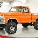 Interior Beige interior Bench seat Ididit tilting steering wheel Dakota Digital gauge cluster Original wood trim dashboard Exterior Ford Tangerine Orange paint Rhino coating under cab Rhinolined bed Chrome bumpers Chrome grille Chrome trim Chrome wheels 35" offroad tires Deaver lift kit