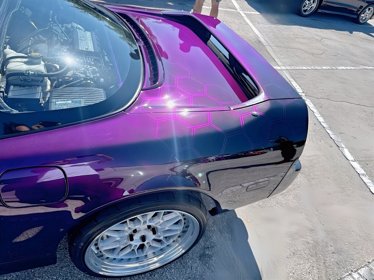 The exterior has been completely disassembled and professionally refinished by Jeff Doane at Paint Pro’s, a respected family-owned business in Jacksonville, Florida. It now features a stunning House of Kolor Candy Purple two-tone finish, accented by a black honeycomb airbrushed design. Additional exterior modifications include a rear spoiler, antenna delete plug, third brake light strobe module, and Route KS carbon-fiber B-pillar covers. The car was originally finished in Berlina Black (NH-547).