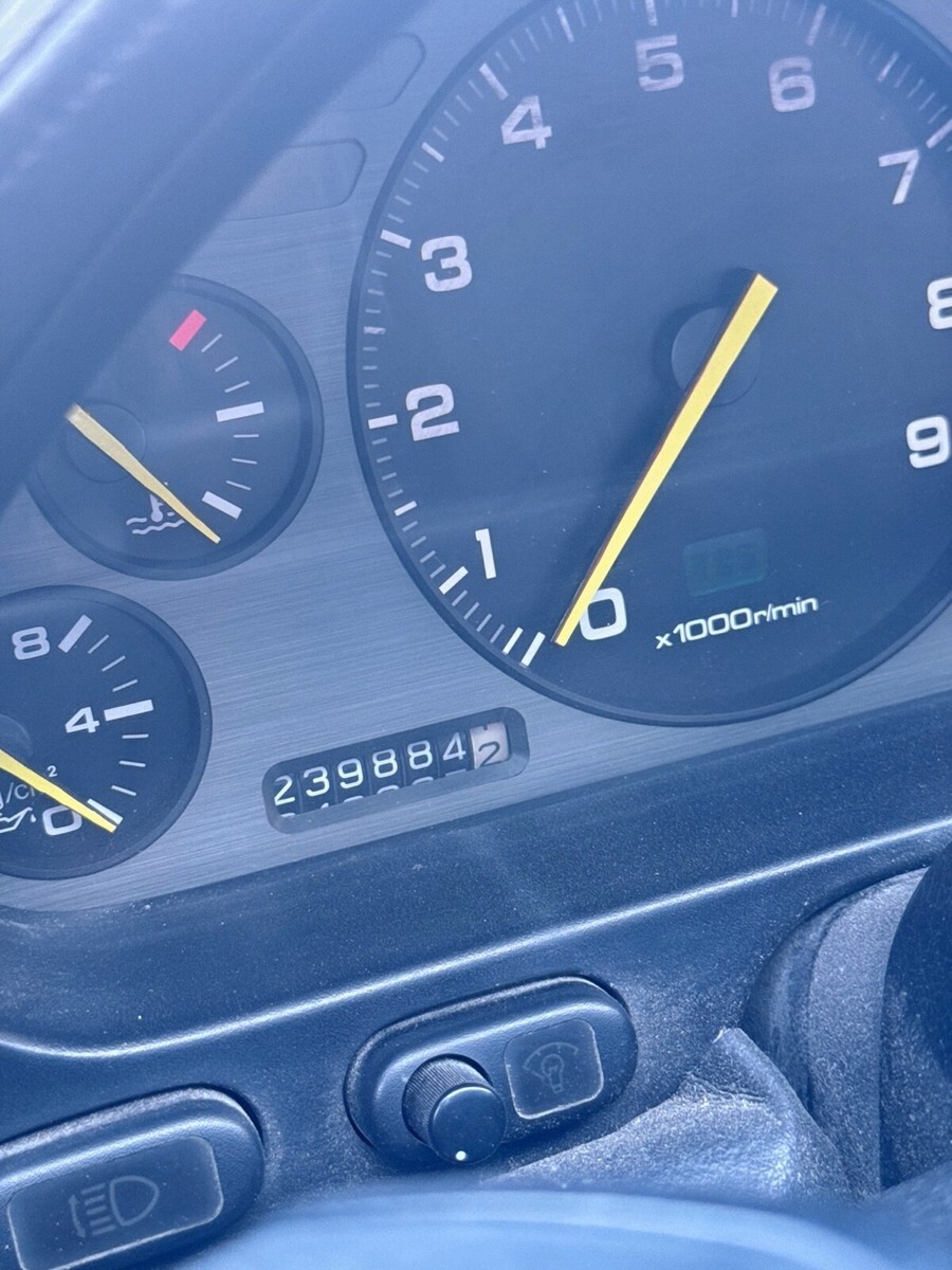 The leather-wrapped steering wheel frames a 190-mph speedometer, an 8k-rpm tachometer, and gauges for oil pressure, coolant temperature, voltage, and fuel level. The six-digit odometer currently shows 240,000 miles.