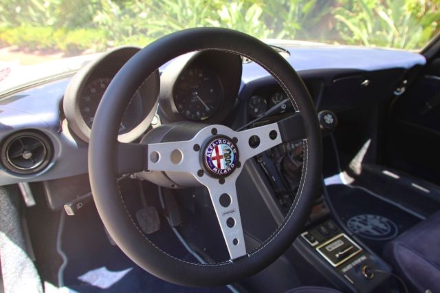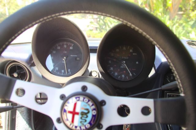 Motor runs smoothly and has Anza exhaust. The 5-speed transmission shifts perfectly in all gears including 2nd gear. Car is fitted with a custom Momo Prototipo wheel with Alfa horn button. The original front bumper was removed and backdated to early stainless bumper and grill. The rear bumper was removed and alloy block off plates cover the holes. Rear Kamm panel was blacked out with Italian license plate and mount fitted. Early style plexiglas headlight covers cover the headlights. The side mirrors are backdated to Alfa “early style” round mirrors. Wheels are 5 spoke factory Campagnolo magnesium alloys in great condition.