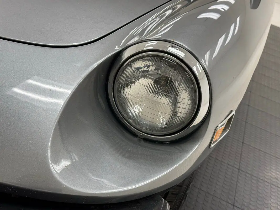 This bullet shaped roadster begins with a pointed nose and a hood set far back from the fascia, leaving a smooth panel up front that's not only shaped like a shark, but colored like one too in Silver Metallic. Headlights set back in a cove also cap the arched fenders that set the straight shoulder line that rolls flush with the flat decklid. The rear fascia meets the decklid with a right angle and its vertical presentation includes tri-colored tail lights over a straight bumper and single exhaust tip that's just off center. In profile, the waistline of the car is formed by body lines that connect the 14-inch Alfa wheels wrapped in 185/70R14 tires with a late 2021 date code. The black canvas top is in great shape, while imperfections on the exterior include some scuffs on the nose, numerous bubbling and rust spots, chips on the door edge, the rubber guard peeling from the chrome bumper, various scratches and chips, and cracking paint.