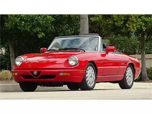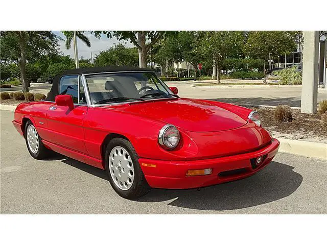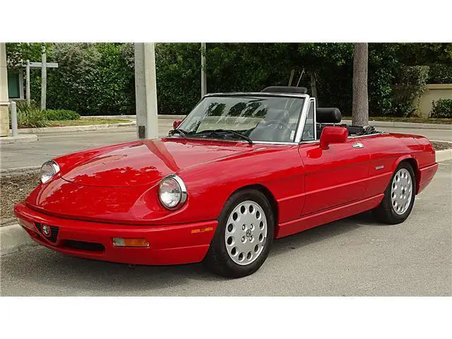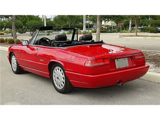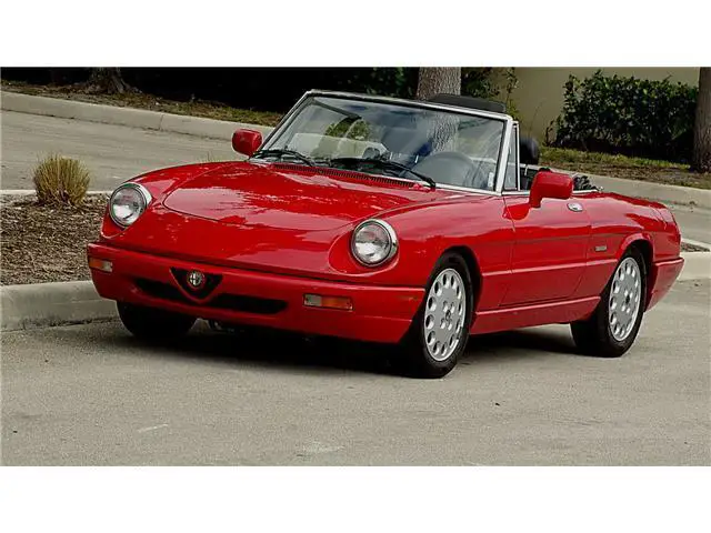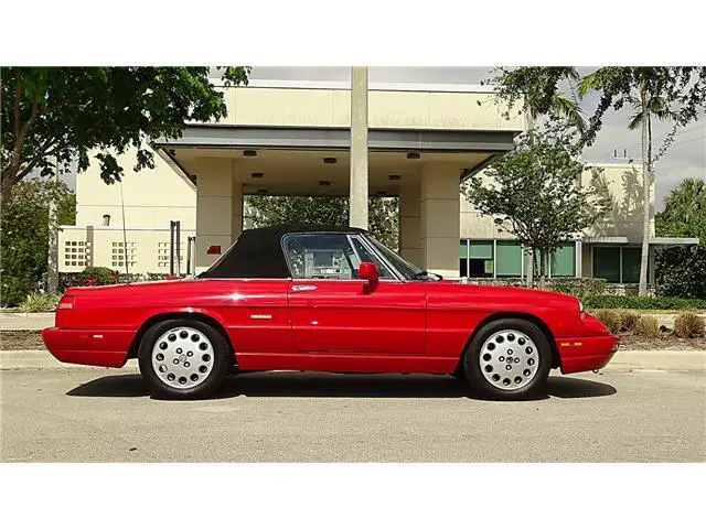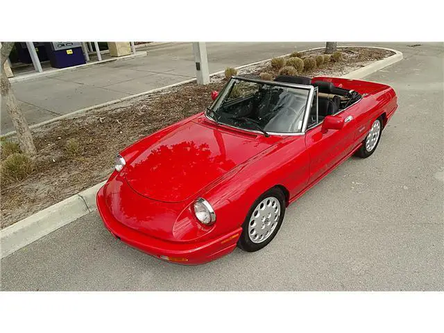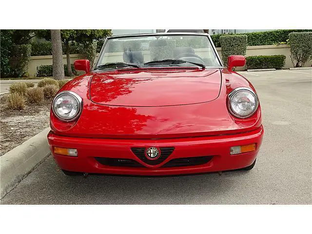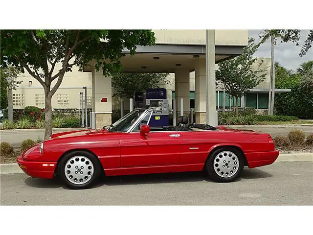 Year 1993 Make ALFA ROMEO MODEL SPIDER Engine 2.0 LITRE Transmission 5 SPEED MANUAL Mileage 64000 Color RED/BLACK VIN ZARBB32NXP7005727HERE WE HAVE A 1993 ALFA ROMEO SPIDER VELOCE WITH 64000 ONE OWNER MILES. HAS THE ALFA RED EXTERIOR FINISH IN FINE CONDITION SHOWING ONLY VERY MINOR IMPERFECTIONS. THE BLACK AND GREY LEATHER INTERIOR IS IN EXCELLENT CONDITION WITH ONLY LIGHT WEAR. THE BLACK CANVASS CONVERTIBLE TOP IS IN GREAT SHAPE SHOWING NO WEAR. THE CONVERTIBLE TOP IS MANUAL UP AND DOWN AND EASY TO DO. HAS ALL THE STANDARD EQUIPMENT THAT CAME WITH THIS MODEL YEAR. AFTER MARKET RADIO BY PIONEER. RUNS STRONG FROM THE 2.0 LITRE ENGINE AND 5 SPEED MANUAL TRAMISSION. A TRUE CLASSIC ITALIAN SPORTS CAR. GOOD SET OF TIRES MOUNTED ON FACTORY ALLOY WHEELS. THIS ONE IS READY TO BE ENJOYED.