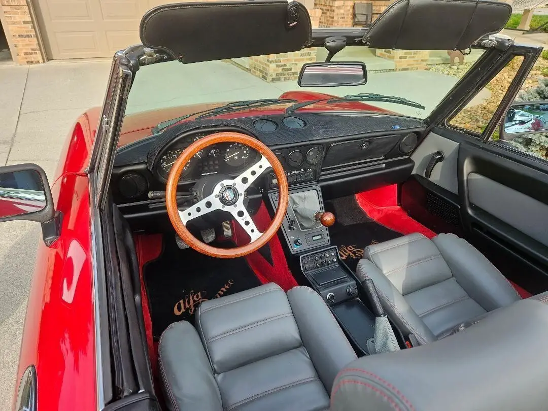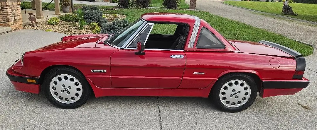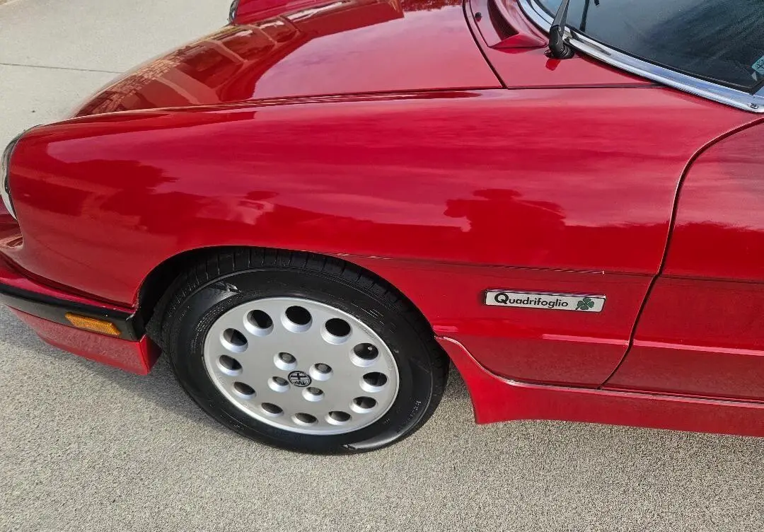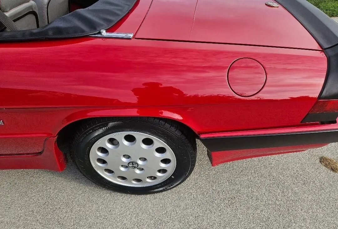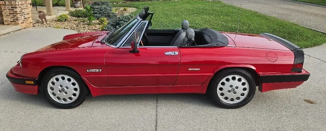 This 1989 Alfa Romeo Spider Quadrifoglia was purchased in 2024 and is registered in Tennessee. Finished in Alfa Red over Slate Gray upholstery, the car is powered by a 2.0 L twin-cam inline-four paired with a five-speed manual transmission. It has 84, 668 miles. Features include a limited slip differential 15" OEM dial wheels, four-wheel disc brakes, a black convertible soft top, black boot/cover for soft top, a removable hardtop, a rear spoiler, bucket seats, Nardi steering wheel, OEM stereo, air conditioning and power windows. This S3 Spider Quadrifoglia is offered with spare parts, spare tire, OEM steering wheel, Sony disc player with FM radio, car cover, service records and a clean TN title.