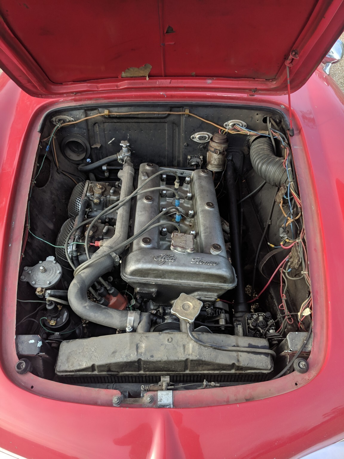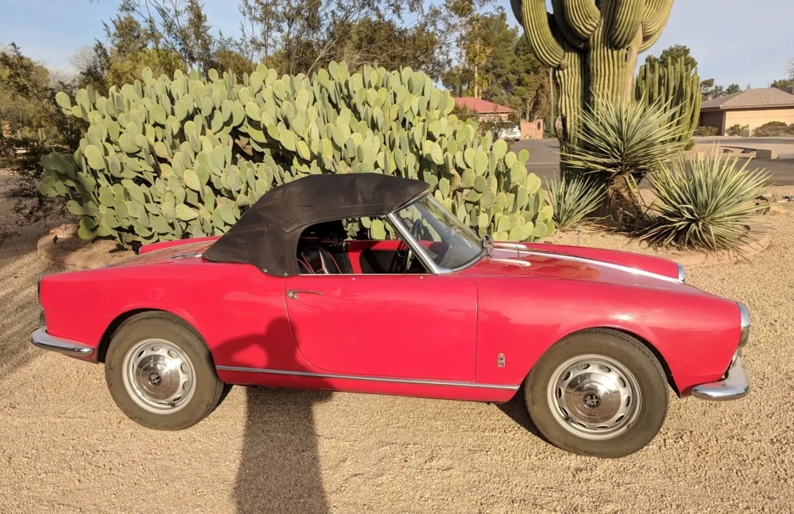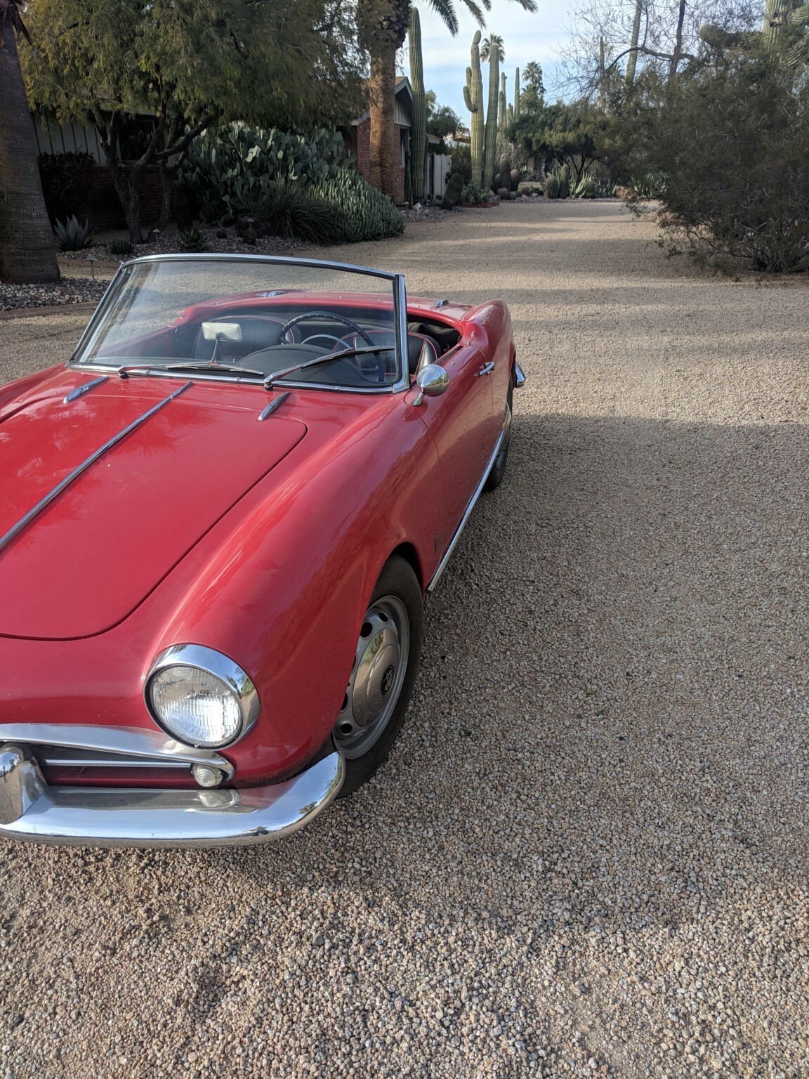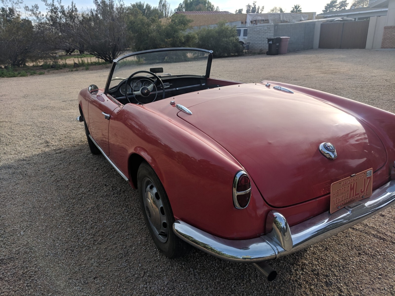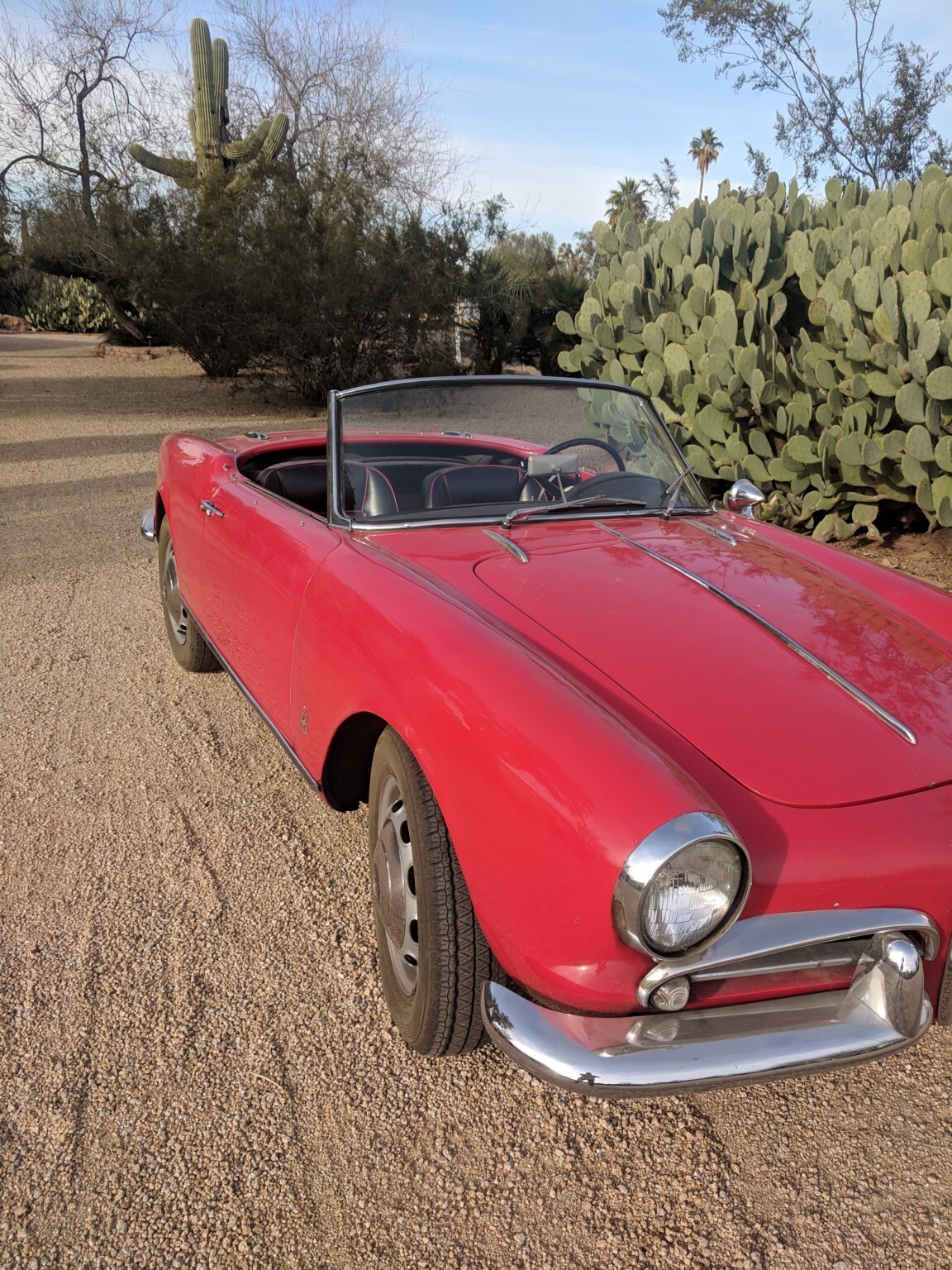 This 1959 Alfa Romeo Giulietta Spider Veloce is a short-wheelbase 750F model that was imported to the US when new by the Hoffman Motor Car Company and reportedly left the factory finished in Celeste Blue. It is powered by a numbers-matching 1,400cc twin cam inline-four paired to a replacement 5-speed manual gearbox and currently wears an older red repaint over a black interior. It was acquired from a collector in Indiana and drove home to Arizona where I now reside. I initially purchased the car with plans to perform a rolling restoration, however that never materialized and I ended up just addressing the mechanicals and driving the car as-is. This Giulietta Spider Veloce is now being offered with ten years of service records, correspondence from Alfa Storico, some spare parts, and a clean Arizona title in my name.