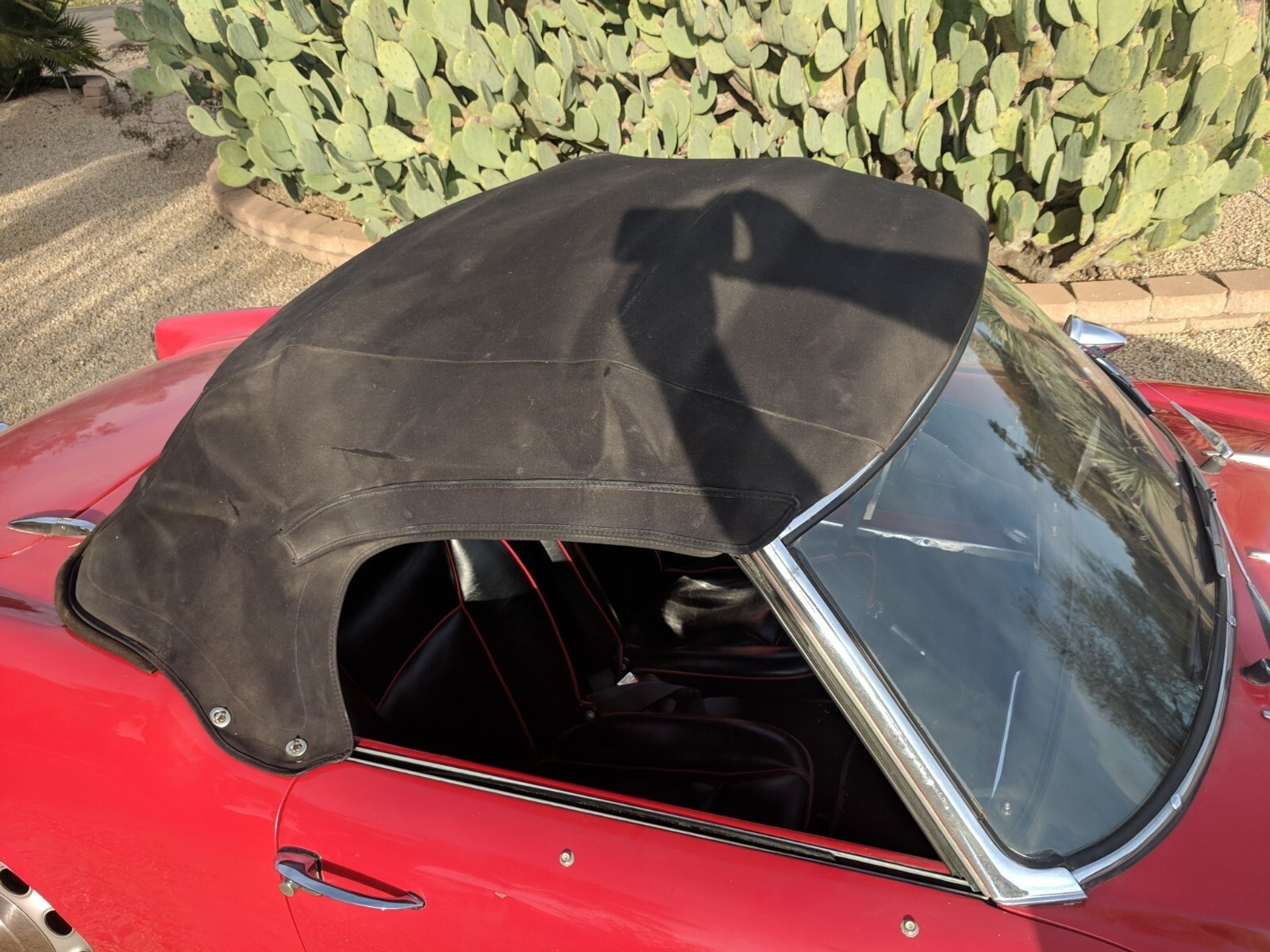 The black convertible top and frame stow behind the seats and a few blemishes are present in the canvas. Factory steel wheels wear a set of chrome hubcaps, and the brakes are currently pulling to the right and should be serviced before the car is driven any considerable distance.
