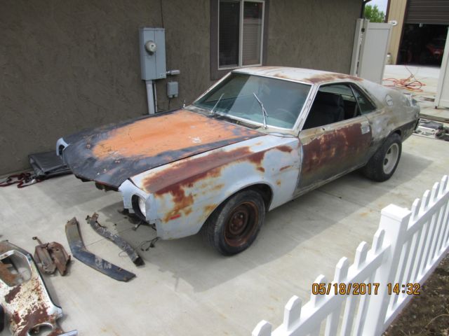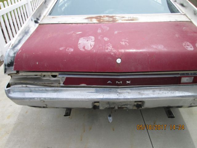 1968 AMC AMX, 390 CI, 4 Barrel, Engine with Factory Air Conditioning. I have a clear title in my name. This AMX is a number matching, dry western, car. It has a solid body with only minor surface rust. I've taken photos of the floors, front and rear - as well as photos from underneath the car. I purchased the AMX as a restoration project and have collected an extra fender, door, passenger's side rearquarter panel, and several small parts in preparation for the restoration. The engine has not been started for several years, but turns freely and appears to have good compression. I don't want to oversell the AMX and the reserve on the car is well under its value. It needs to be restored, but it has the correct engine, a corrosion free body, and is highly optioned with air conditioning. Please look closely at all of the photos. The passenger's side rear quarter panel has a dent. I think it can be corrected with body work, but a complete passenger's side rear quarter comes with the car. All of theglass is good, but the windshield has a crack. There is a smaller dent on the driver's side rear which will need to be corrected before re-installing the taillight. The front bumper is not dented, but the chrome is shot. Again, please look closely at the photos. The history of AMC's AMX is interesting. AMC wanted to compete against GMC's Corvette. This small, two bucket seat, coupe was their answer. The 1968 AMX, 390 CI, 4 Barrel Carbureted car was there entry vehicle into themuscle car arena. This highly optioned AMX is a worthwhile restoration project. I will gladly assist the shipper you select in shipping the AMX anywhere in the world. I'm not a car dealer. I just have too many projects and I can't afford to restore the AMX. If you have fewer than 5 positive feedback on Ebay, please message me or give me a call before bidding. My name is Bob and my phone number is (801) 745-5835. Good luck bidding, and hope the AMX finds a good home.