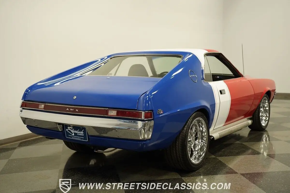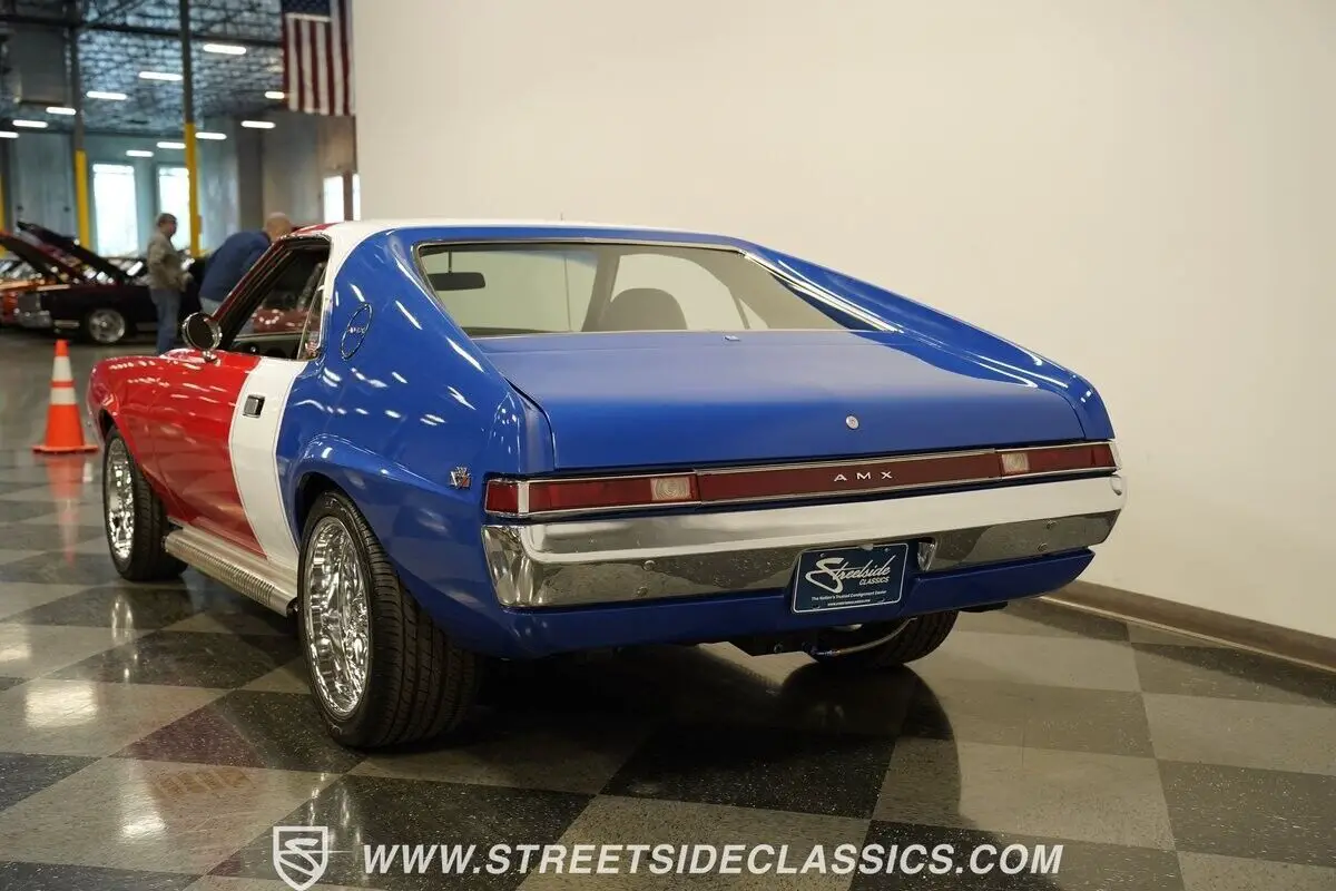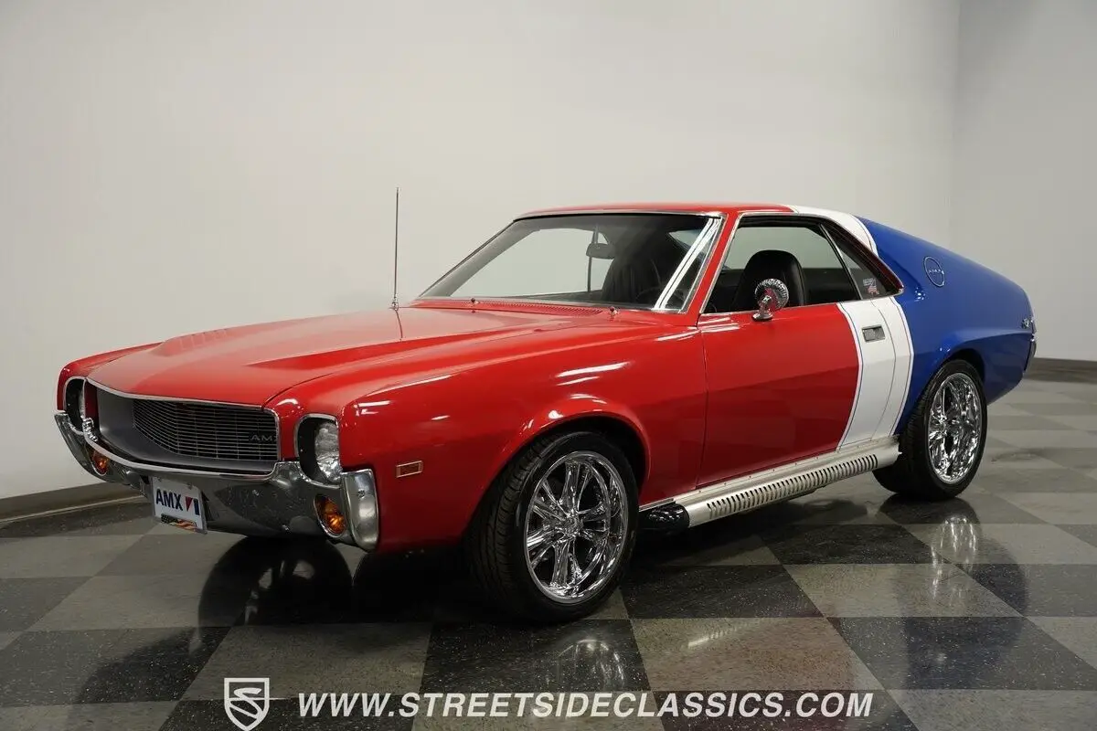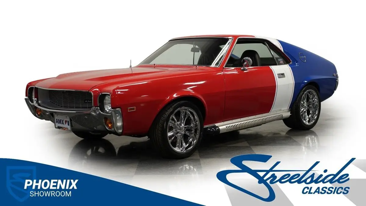 Vehicle Original VIN : A8C397X2504754047-PHX 1968 AMC AMX Born in AMC's first year of AMX production, this 1968 AMX rocks the company's signature racing livery in red, white, and blue with pinstripes slicing through the white section. The aggressive two-door profile gets an extra kick from cool sidepipe exhausts. The stance achieves pure muscle car perfection through a staggered combination of 17-inch front and 18-inch chrome Foose wheels wrapped in 215/45R17 front and 285/35R18 rear performance tires. The black vinyl interior delivers pure performance-focused minimalism. Bucket seats with perforated inserts anchor the cabin, while a B&M ratchet shifter and a compact wood steering wheel put total control at hand. Three auxiliary gauges mounted in the center dash provide vital information, while a vintage-style AM/FM/AUX stereo adds modern audio capabilities. The center console houses the fuel pump, ignition, and radiator fan controls. The desireable 390 V8 powerplant runs through a 3-speed automatic transmission featuring a Gear Vendors overdrive unit. Performance upgrades include an Edelbrock high-rise aluminum intake, Performer 401 heads, HEI ignition, and a Quick Fuel 4-barrel carburetor. The drivability benefits from Wilwood disc brakes with slotted and drilled rotors, a CPP steering box, and Caltracs bars on the AMC 20 rear axle. An aluminum radiator with dual electric fans work to keep temperatures in check. HIGHLIGHTS: • 390 V8 Engine • 3-Speed Automatic Transmission with Gear Vendors Overdrive • Quick Fuel 4-Barrel Carburetor • Edelbrock High-Rise Aluminum Intake • Edelbrock Performer 401 Heads • HEI Ignition System • CPP Steering Box • Edelbrock Headers • Aluminum Radiator with Dual Electric Fans • Wilwood Disc Brakes with Slotted/Drilled Rotors • AMC 20 Rear Axle • Caltracs Bars • Side-Exit Exhaust with Glasspack Style Mufflers • Red, White, and Blue Paint with Pinstripes • 17-inch Front and 18-inch Rear Chrome Foose Wheels • 215/45R17 Front, 285/35R18 Rear Tires • Side-Exit Exhaust Pipes • Black Vinyl Interior with Bucket Seats • B&M Ratchet Shifter • Wood Steering Wheel • Three Auxiliary Gauges • Vintage-Style AM/FM/AUX Stereo • Power Steering • Custom Console-Mounted Controls This 1968 AMC AMX combines raw American muscle with race-inspired styling, upgraded performance components, and a driver-oriented interior. With its potent 390 V8 and distinctive tri-color scheme, this two-seat muscle car represents pure American performance. Call today!