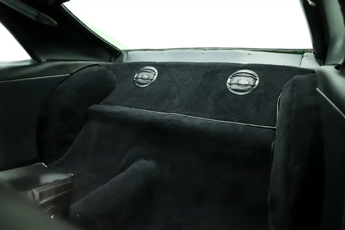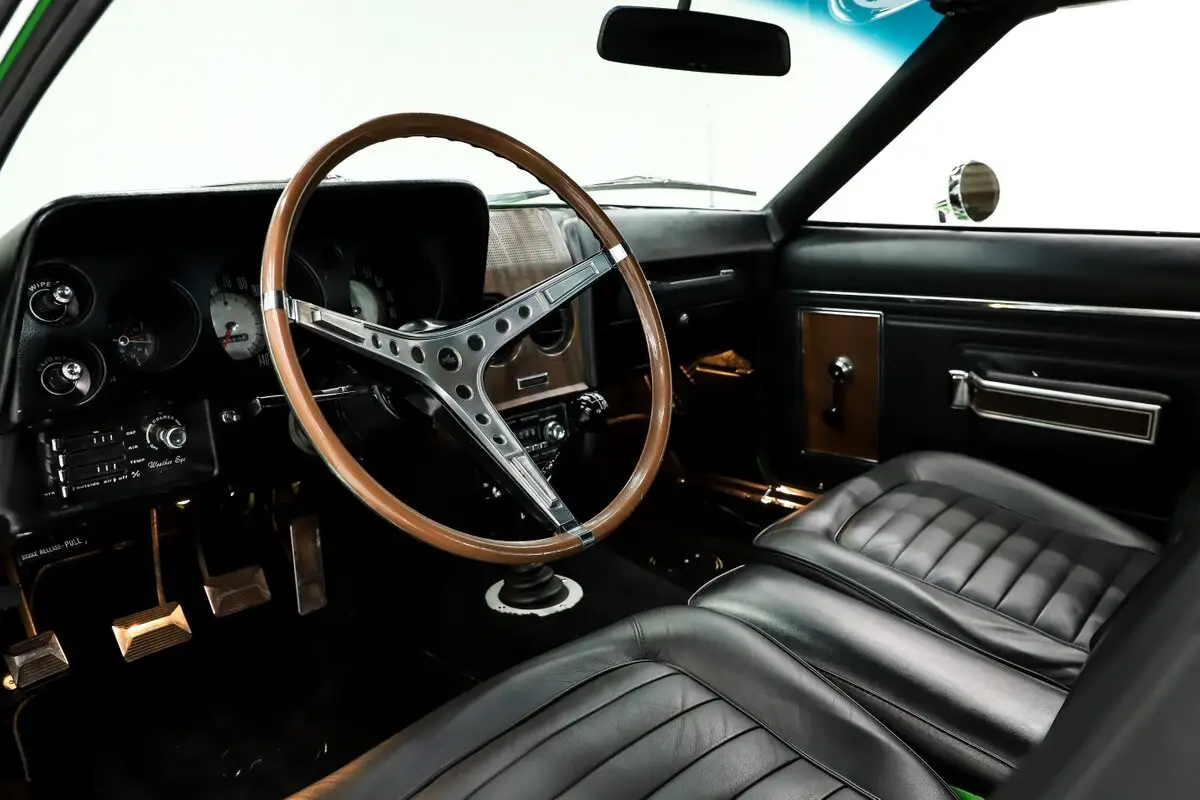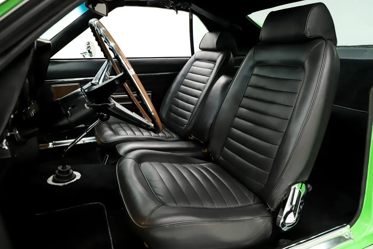 EXTERIOR: Make a bold statement! The Big Bad Green paint stands out in a crowd on top of being super rare. It was applied with great attention to detail and polished to a slick and shiny reflection. The black stripes are a vinyl decal just like the factory did it. When looking down the side of the laser straight body you'll be satisfied with all the smooth contours and crisp lines. The panels have been painstakingly aligned with good gaps that are well above average. Part of the Big Bad green package are the color matching bumpers and the rear is equipped with bumper guards on this one. The hood with dual bulges and fish gills provides a pleasant, yet aggressive aesthetic. The tail lights appear to have been replaced and look like new. All the brightwork has a glorious shine and the emblems are in great shape. The entire ensemble is rolling on 14" steel wheels were stripped and powder coated in the correct glitter finish, the trim rings and caps were replaced. They are wrapped in reproduction Goodyear Polyglass redline tires.