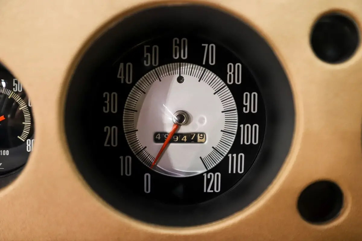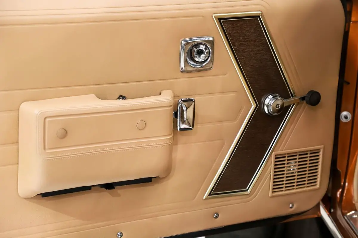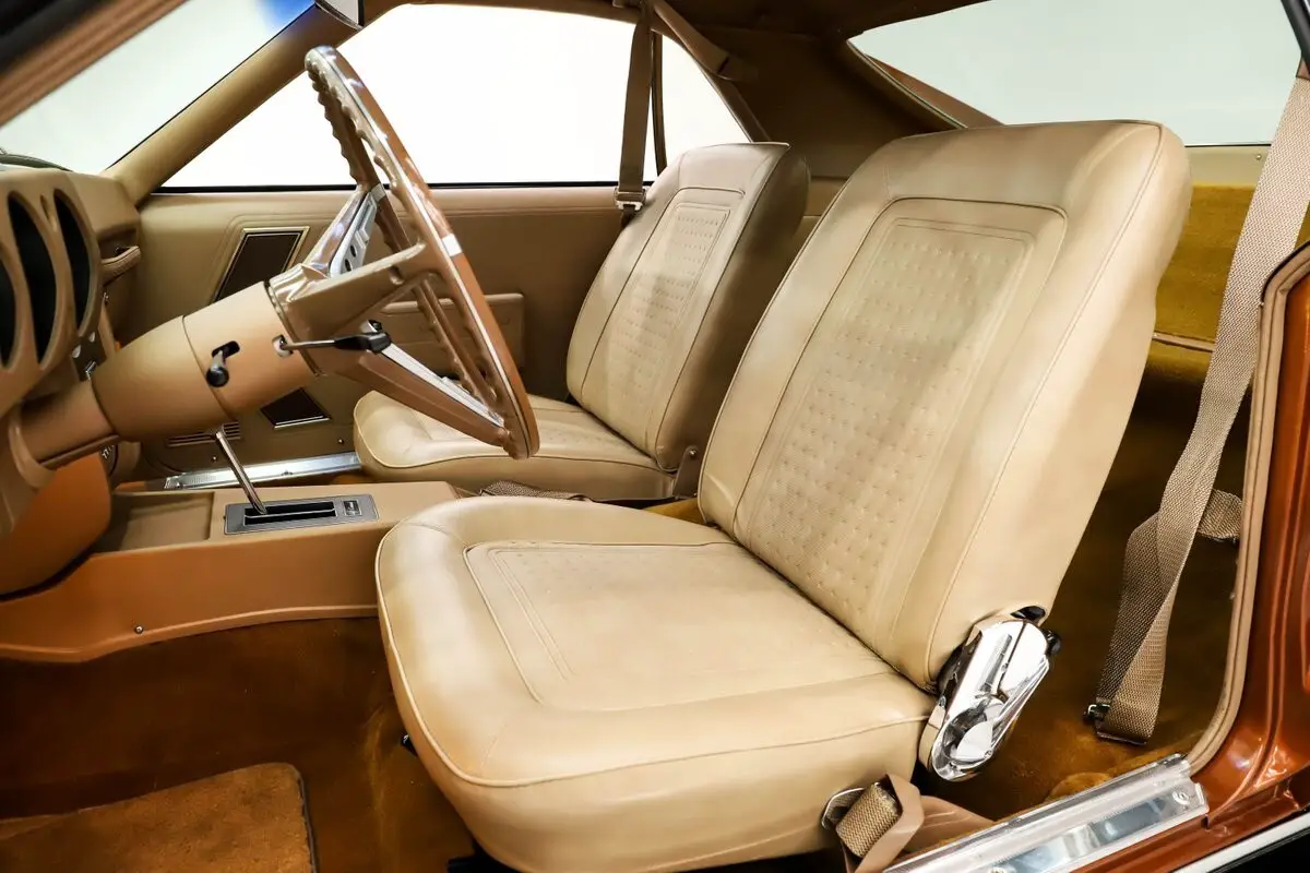 INTERIOR: I sat in this car and immediately thought, Wow! It is pretty immaculate inside. It has a premium Legendary Interior, it even came with a certificate saying it is concours quality. The door panels, armrests, cushions and upholstery were replaced. The dash area is mint including the gauges, knobs, bezels, heater control panel etc. It features a tachometer, and original Am-Fm stereo. The steering wheel is mint and on a tilt column. Fresh carpet front to back and embroidered mats. The center console is home to the Shift Command shifter.