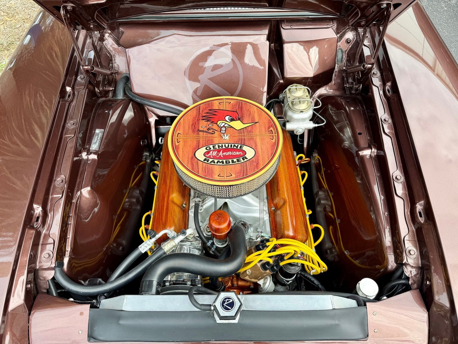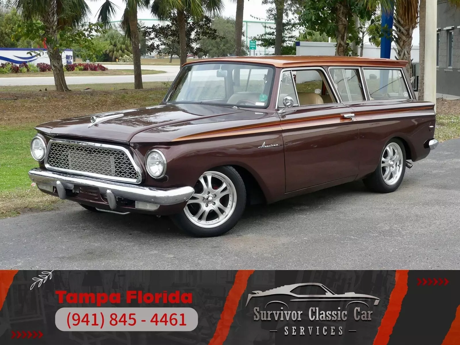 We are pleased to offer this amazing 1961 American Rambler wagon street rod for sale. This custom beach cruiser is absolutely amazing inside and out. The attention to detail is incredible and is everywhere you look. Let's start with the exterior. This wagon was soda blasted and has been painted in a beautiful dark brown metallic on the bottom and burnt orange metallic on the roof using Matrix paint. It is broken up by a custom pinstripe with some faux wood on the quarter panels. American Racing aluminum alloy wheels give this car a touch of modern styling and are wrapped in radial tires for a great ride. Inside, you are greeted by heated bucket seats, a custom center console with floor shifter, tilt steering column, woodgrain steering wheel and a Clarion AM/FM/CD player. Custom door panels have the Rambler logo raised for a neat and classy touch. The front and rear seats have seat belts to keep you and your passengers safe, and the Optima Yellow Top battery is in the rear section with a cool custom wooden trunk to cover it. The trim on the inside is all painted in a faux wood finish and then satin clear coated, which not only looks cool but gives the interior a beachy woody wagon feel. The AMC 343 CID V8 engine is built and show quality in appearance. The engine and transmission have been completely rebuilt and the block, heads and oil pan are painted in a beautiful bronze metallic that looks great in the engine compartment and underneath the car. The valve covers have been given the faux wood treatment as well, and it is sure to draw stares at any car show you attend. The air cleaner is custom with a wood background with Mr. Horsepower and some custom pinstriping. The air cleaner nut is a piece of cork with the nut inside. Like I said, there are neat details everywhere you look in this beach cruiser. The Rambler logo is painted on the smoothed firewall with a pearl and is emblazoned on the radiator cap as well. A chrome alternator, chrome A/C compressor, aluminum radiator with electric fan and billet overflow all help bring this engine compartment to a show quality level. Let's dig into the mechanical aspects of this beauty next. The American 343 engine is built with an Edelbrock RPM Air Gap intake and Edelbrock 500 CFM 4-barrel carburetor. The exhaust is a dual setup with ceramic coated manifolds running to glass packs for a nice muscle car rumble. It is mated to an AMC automatic transmission and ends up out back at a Ford 9" rear end with cruiser friendly 2.50 gears. Four-wheel disc brakes provide plenty of stopping power and a Mustang II style front end with rack and pinion steering makes for a nice ride. This Rambler completed the Hot Rod Power Tour and has the "Long Hauler" sticker on the back to prove it. It was built to be driven and enjoyed and is sure to put a smile on your face. This AMC Rambler wagon has won numerous awards including the 2014 AMO Gold Award. The car was driven from Florida to South Carolina, awarded Gold and then driven home. In 2015 this car was driven from Florida to the Cruisin' the Coast in Biloxi Mississippi and back! This Rambler was featured in the 2015 Matrix Paint calendar as well. The last detail we'd like to tell you about is the fuel tank. The fuel tank is custom painted to look like it is wood, and you can just catch a glimpse of it from behind the car. If you're looking for a one of a kind wagon that is ready to cruise and enjoy, give this Rambler a good long look.