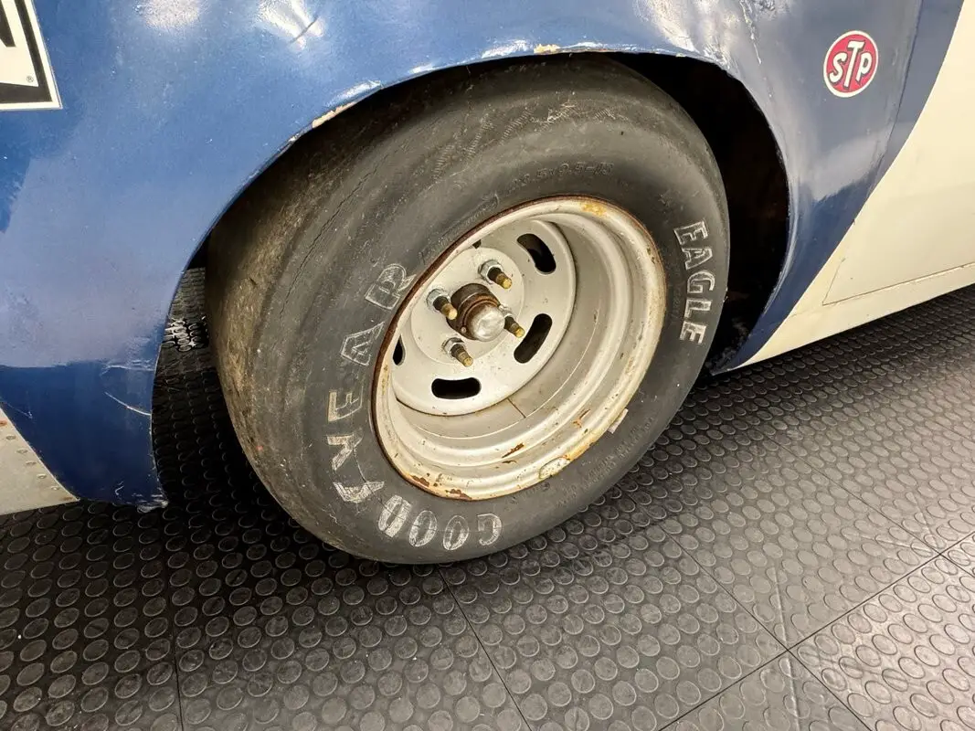 Pure race mode on the inside with a full roll cage, bare metal floors, a single bucket seat, and a padded 3 spoke steering wheel. The dash board is basic with a Holman Moody toggle panel and five gauges. The shifter is on the transmission hump and retains its boot which keeps dirt out of the linkage. Surface rust is noted in the footwells and on the gas tank in back while the rest presents with fitting patina.