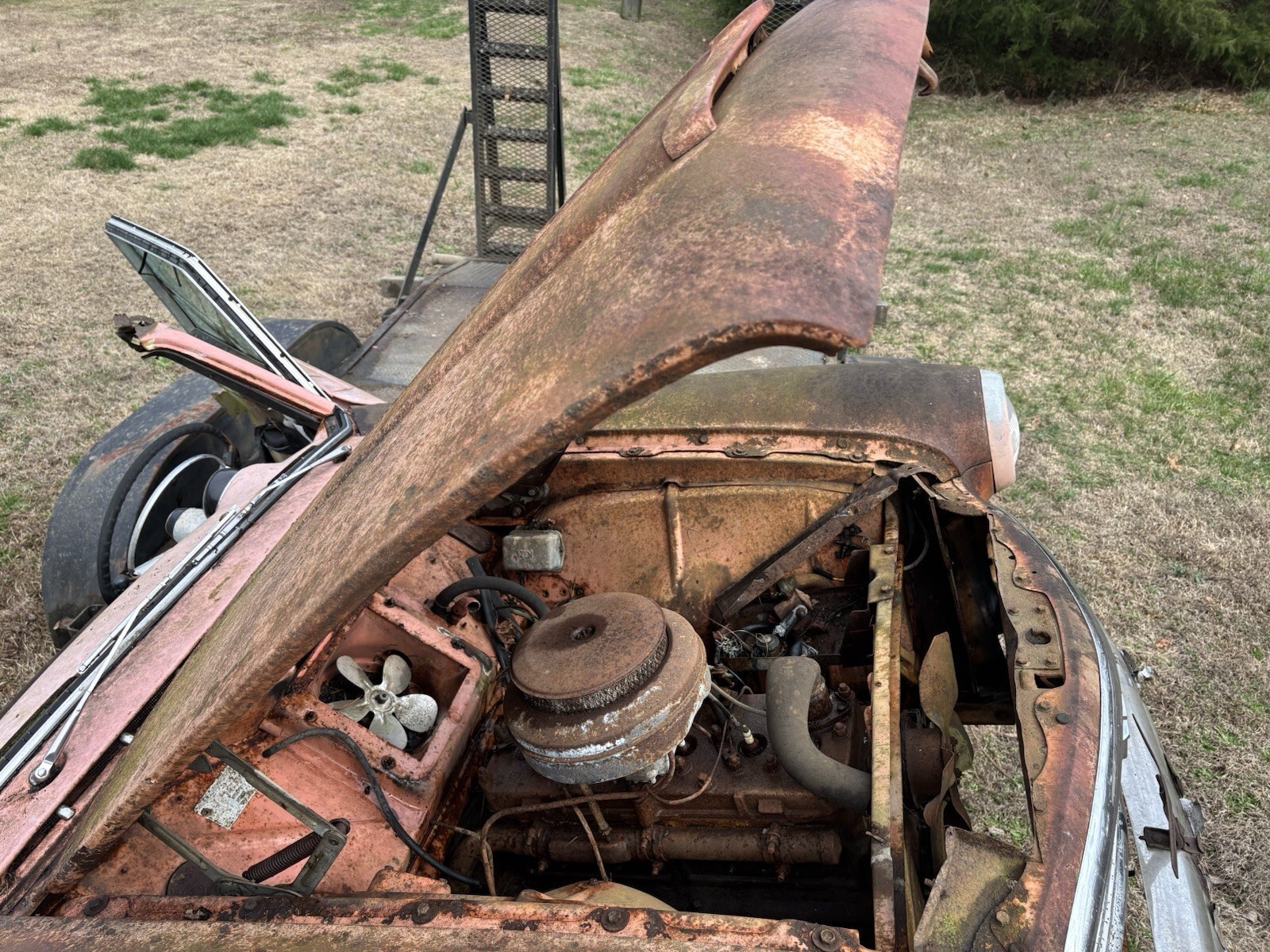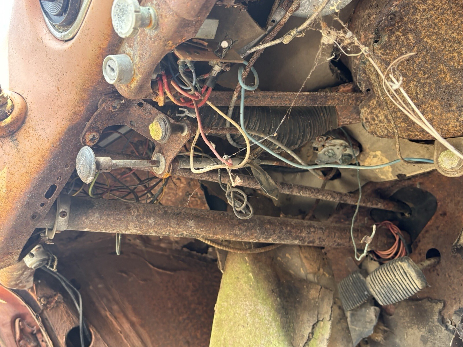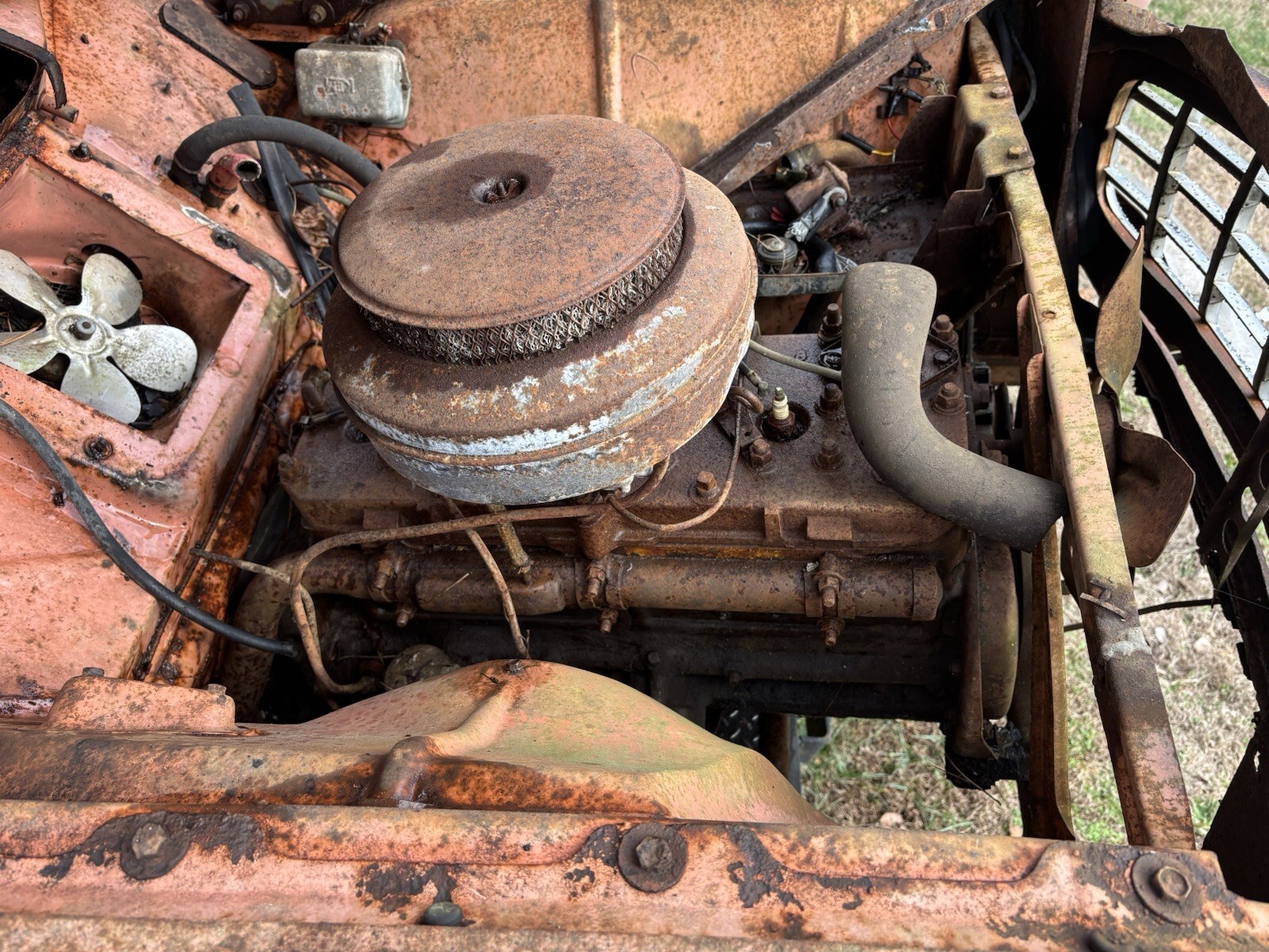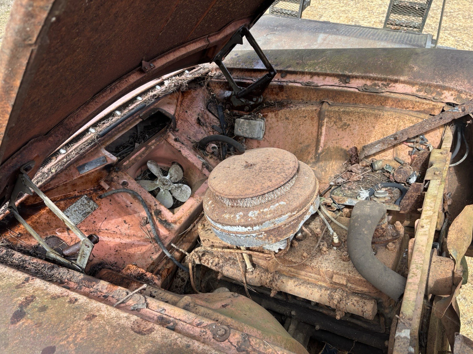 Lots of good parts. Shifter works transmission linkage moves freely. Hood opens and shuts good. Lower half of the fenders have significant rust but could be repaired. Engine appears to be seized but may be rebuildable. Steer wheel turns and suspension moves freely. LH door could be repaired. RH door possibly but it’s pretty rough. This piece has a lot of potential as automotive art. Could be turned into a bar. The dash would make a nice piece with a rustic shelf. I have included some photos for reference. I will sell as a whole or build into art. Message me with any questions. We do have a forklift to help with loading.