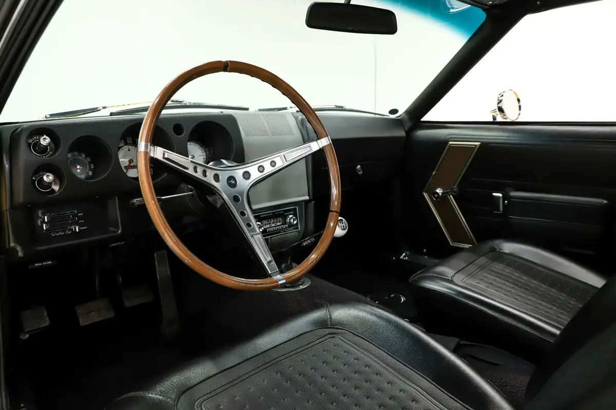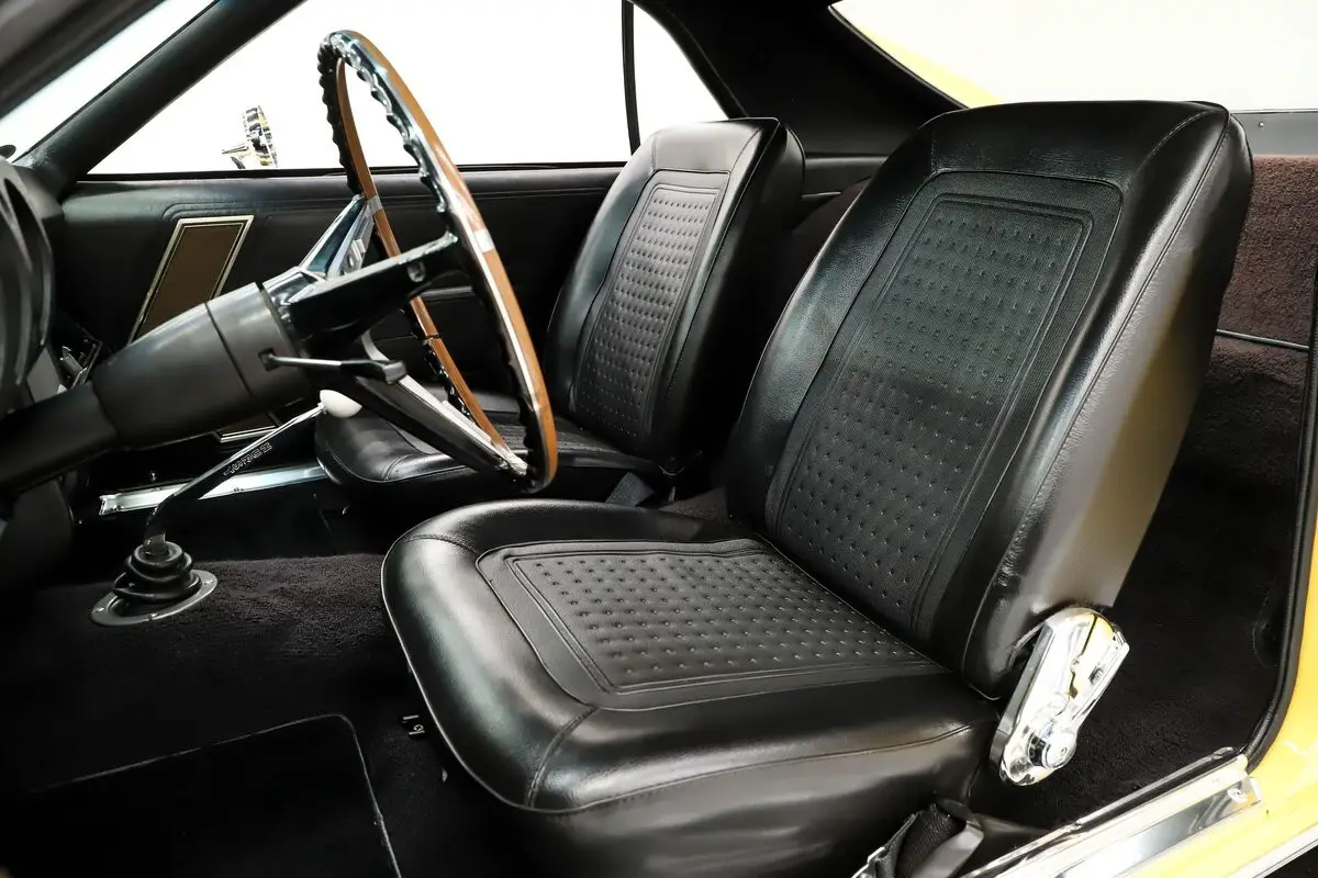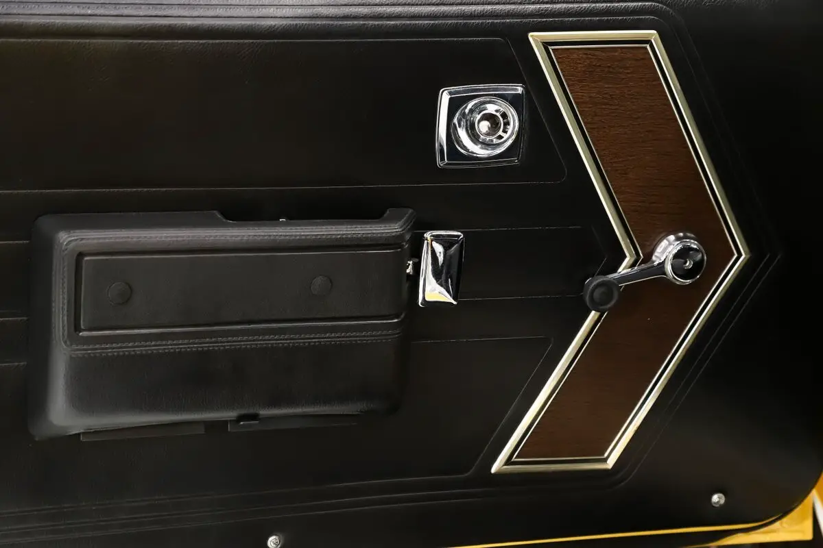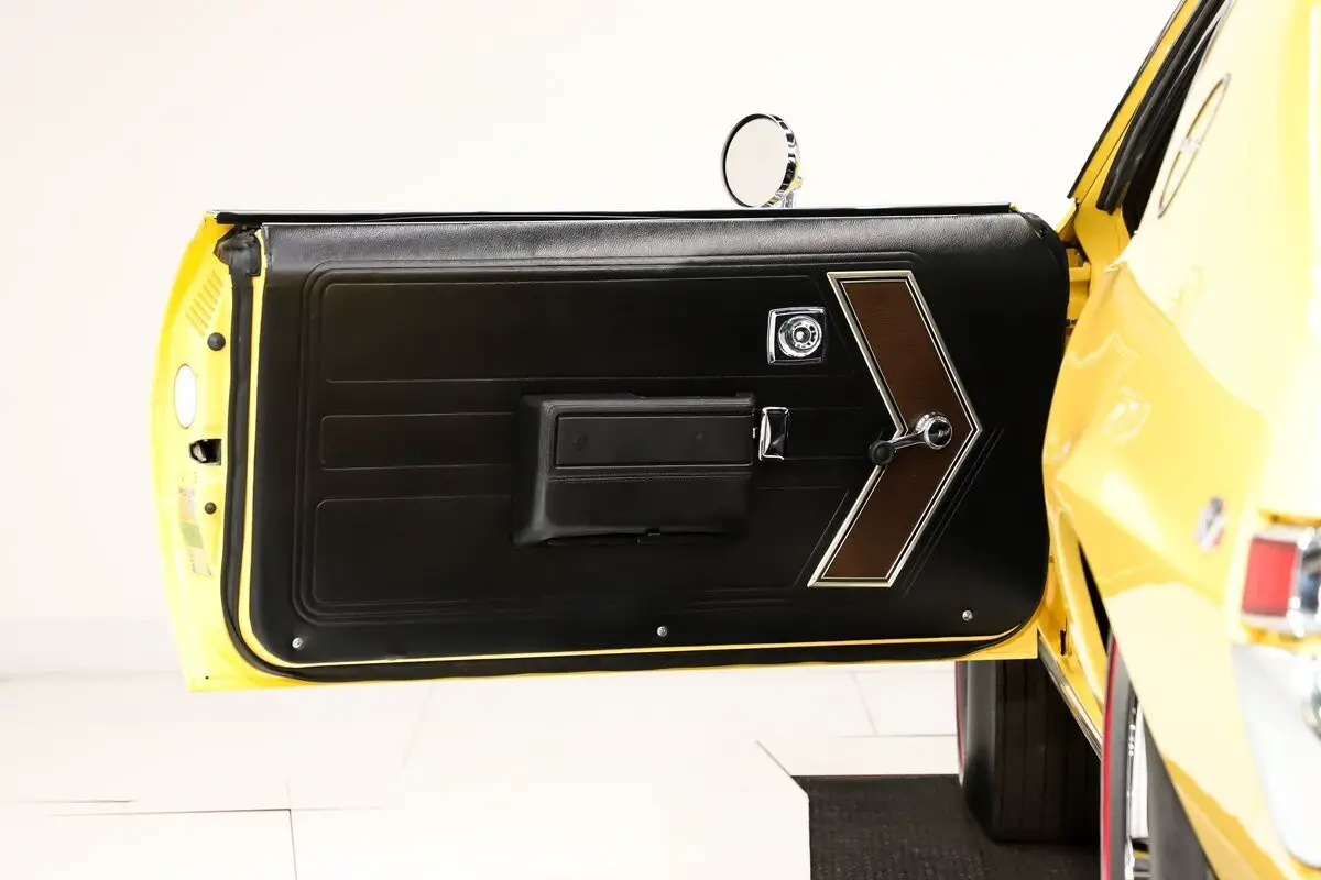 EXTERIOR: It has an unmistakable look, with its short wheelbase giving it a compact, aggressive stance. The long hood, fastback profile, and sculpted body lines deliver classic muscle car proportions with a sporty edge. Claimed to retain its original metal, the body is in amazing condition-laser straight with no rust or damage, and the fit is spot-on. It's a factory yellow car, refinished in a richer shade that looks even better, topped with a smooth, high-gloss finish. The white racing stripes really set it off. The chrome and trim add the perfect contrast-the stainless is straight and polished, and the chrome has been redone. The door handles look fresh and it has optional dual mirrors. The windshield appears new, the rear window is one of the best originals you'll find. It sits proudly on chrome Magnum 500 wheels wrapped in reproduction redline tires for the perfect finishing touch.