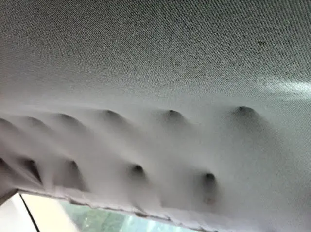 Cardboard covering on inner side of sunroof removed as it was discolored. Doesn't look too bad, but a little skeletal. It is pictured. Inside ceiling covering has been stapled numerous times in back by previous owner. Inside seats are discolored only a little. Pictures show most defects. Some pics from previous seller.