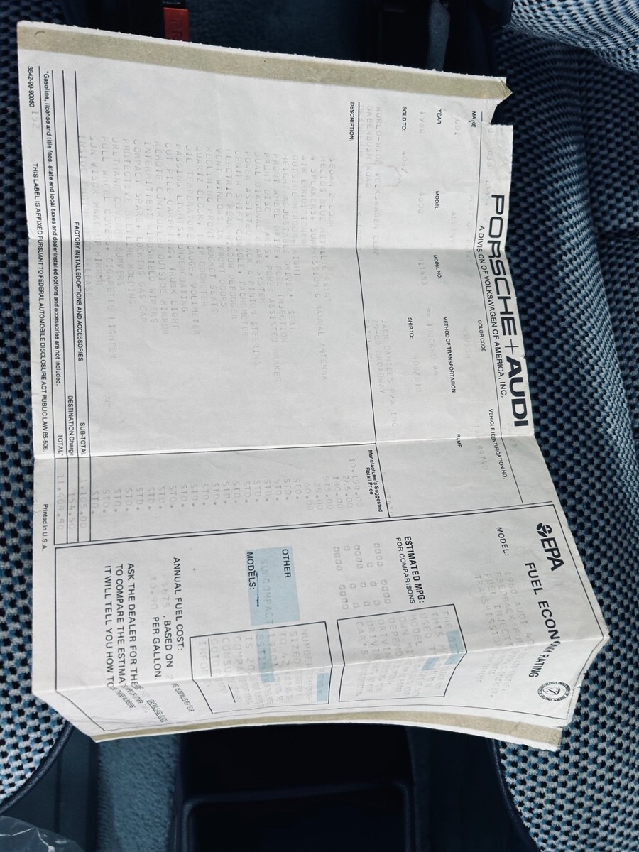 ~ 1980 Audi 4000 2.2L inline 5cyl. This car is basically new. It drives like new. PAINT is original and like NEW. There are minor scratches due to simple age. RUST?? NONE. This car BARELY left a climate controlled garage. ALL gauges work. All lights work. Brakes and suspension are 100%. This is 100% a Time Capsule with only 20,543 miles. ORIGINAL miles. A/C works. Heat works. Smells GREAT. The interior is clean and plush (carpets, headliner and seats). All plastics and interior components are 100%. The car has all new fluids. Has new Cam belts (IMPORTED FROM GERMANY) has new tires (I will include OEM Pirellis). Comes with a trunk load of extra spares and filters. Also comes with factory Window stickers, factory warranty books tools, logs, plaques. It also comes with books and literature from importing dealer. 2 sets of keys. Comes with car cover, and build sheet.