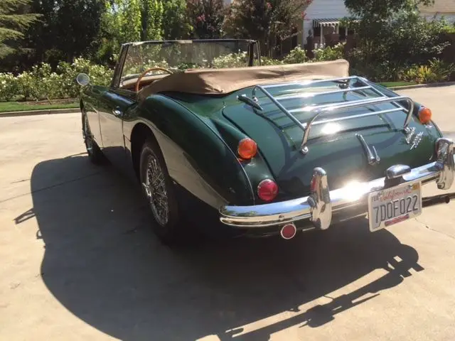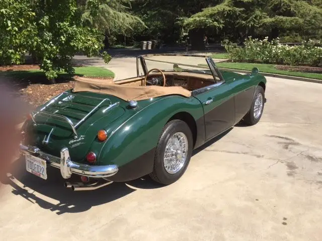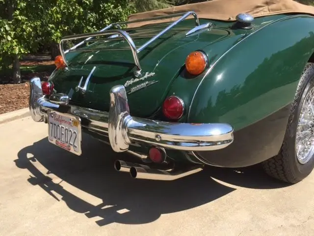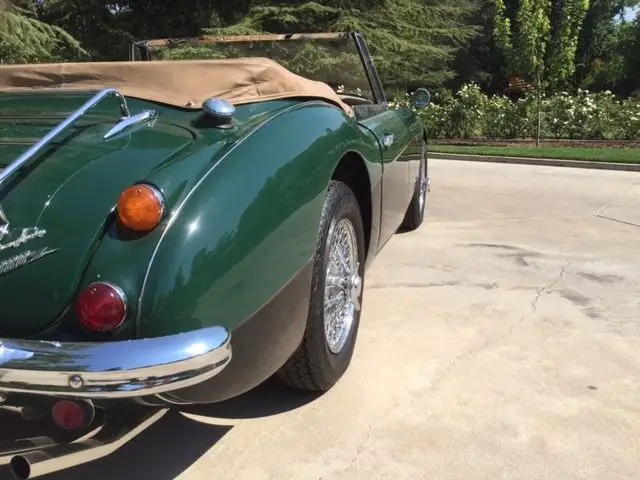 This car is an older restoration that has not been driven much since restored. The work included the usual body work and paint and included an engine and transmission rebuild. The British Racing Green paint is in great condition with no dings or scratches and is shiny and unblemished. The chrome and stainless trim parts are shiny and undamaged except for a minor dent on the front grill. The interior is tan leather that is in good condition with some patina apparent on the driver side seat bolster. The car is in very good mechanical condition and runs strong like a Healey should. The wiring was recently updated and polished stainless exhaust system was added. Very little work is needed to put this car in show condition.