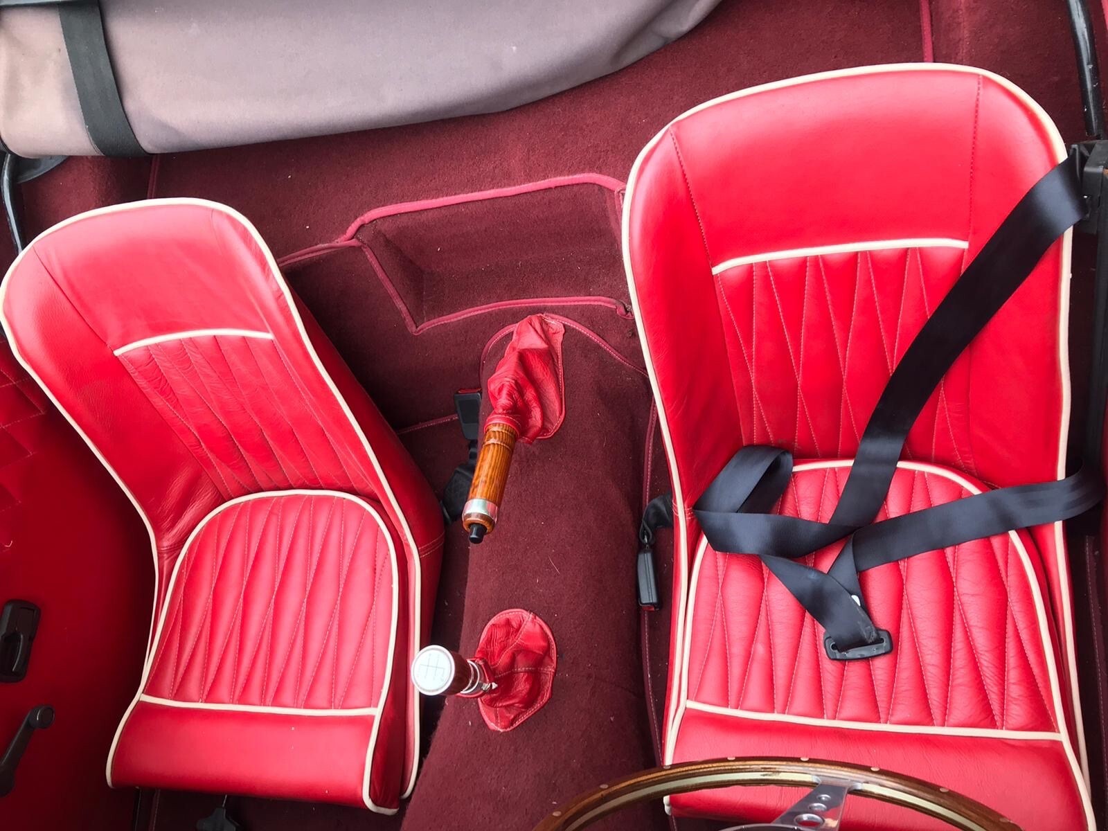 The cockpit is well-finished and subtly luxurious, featuring red leather seats with cream piping and quilted door panels. Deep red carpets are in excellent condition, while period-style gauges, warning lights, and switches are neatly arranged on the dashboard. A wooden steering wheel completes the classic look.