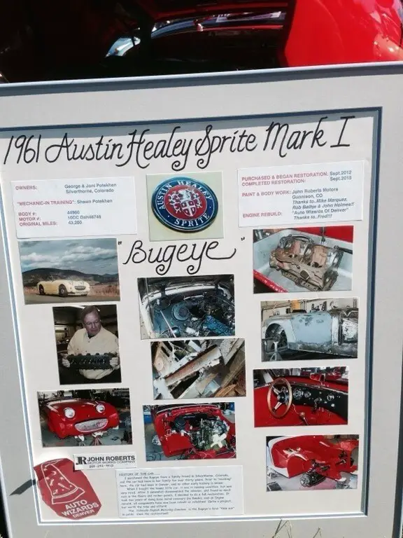 I purchased the car from a friend in Silverthorne Colorado. I had known about the car for years as I was involved in vintage racing for many years. Jumped at the chance to purchase the car as I previously had a Sprite in high school. Mine was Cherry Red so the restoration had to be the same color.