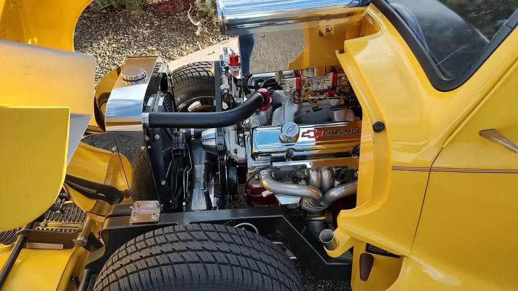 This Austin of England is powered by a 283 V8 engine paired with an automatic transmission. It is shown with a yellow exterior and a gray interior. This vehicle has a tubular frame underneath that is also powder-coated. This vehicle has been well-maintained.