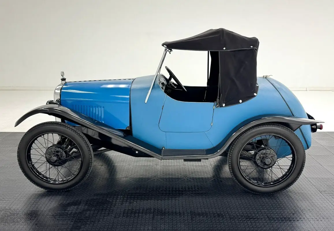 This cheeky little ride is blue but features the unique combination of steel, louvered engine covers and a body and doors that are wrapped in blue grain vinyl. It's soft to the touch and easy to clean! Meanwhile, black painted fenders gently swoop over the 19-inch wire wheels, also in black, and the headlight buckets also share in the dark tone. The grille is standard shaped for the period but smaller in scale and the Austin call out is placed in front. The latched trunk is bulbous and carries a pair of tail lights that flank the license plate, all behind the black canvas retractable top. Imperfections include some crazing in the black paint, chips on the headlight buckets, and scuffs on the fenders.
