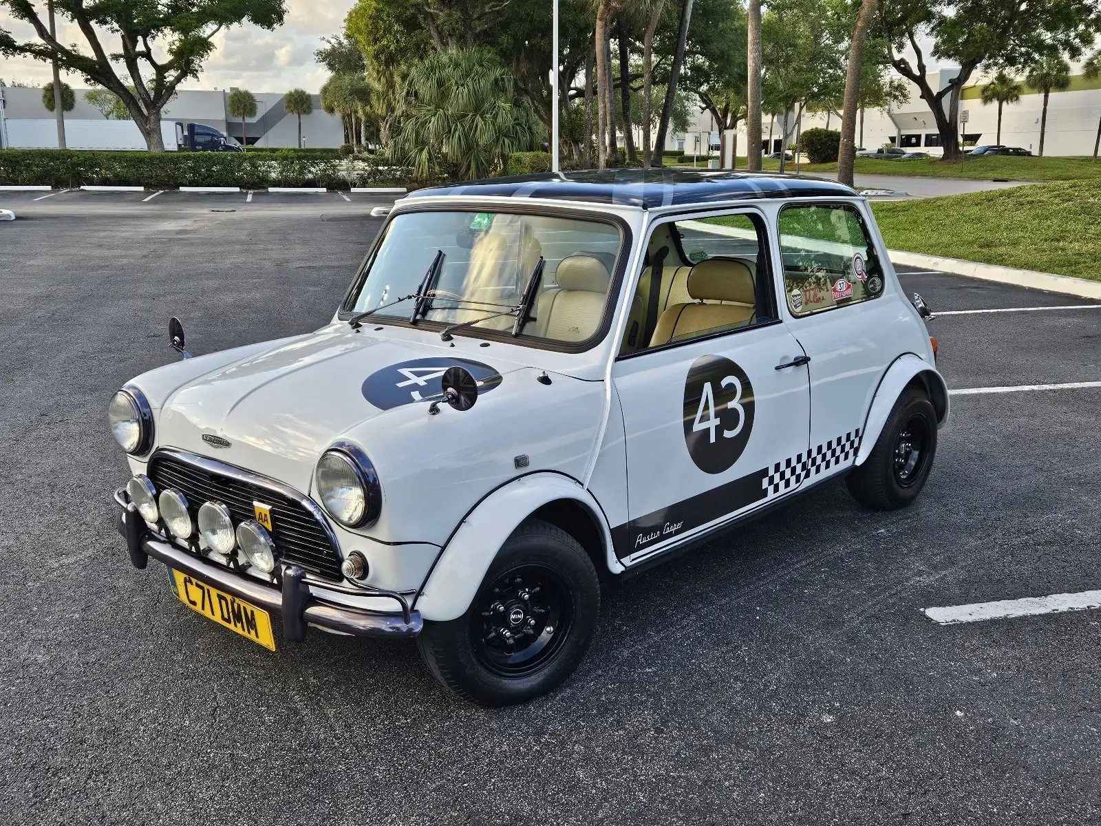 Its classic white exterior is offset by a black roof and matte black Union Jack motif, front fender mirrors, wide fender flares, and a set of 6x10 GB wheels, giving it a purposeful yet playful stance. The quad fog lamps pay homage to the famous Monte Carlo rally racers, reinforcing its sporting character.