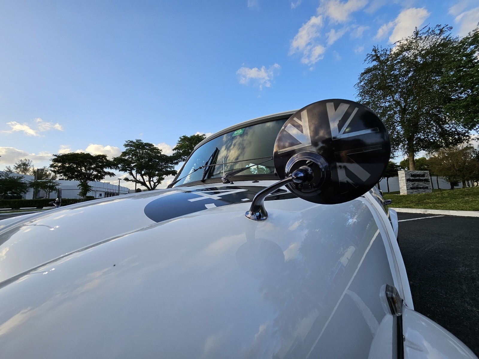 • White exterior with contrasting black roof and matte black Union Jack