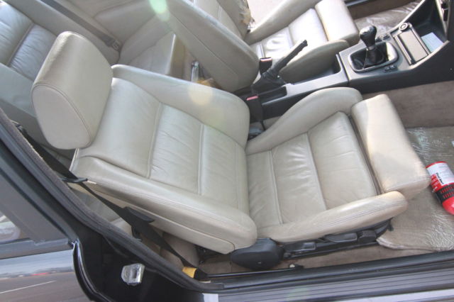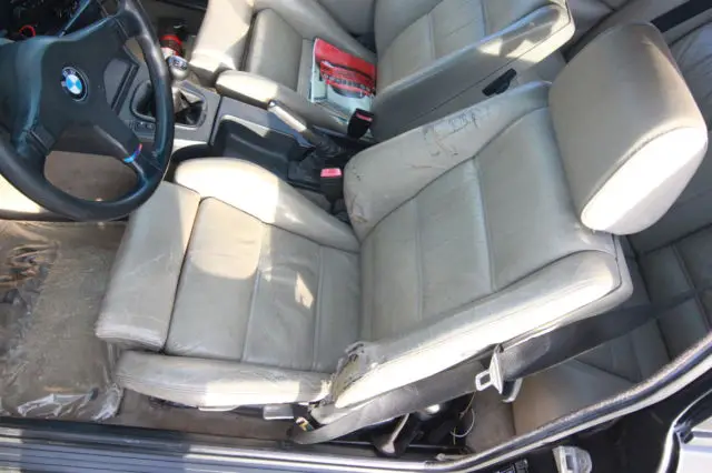 Interior is all original, and all very nice except for the drivers bolsters which are quite worn. I have been searching for a convertible or M3 pearl beige horizontal stitch seat for some time but no success yet. 87-88 only color. Original radio still installed and operating fine, original Mtech 1 steering wheel, original cluster, F and R seats, carpet, floor mats (wrapped in plastic, good shape). Dash is somehow crack-free. Maplight mirror works well.