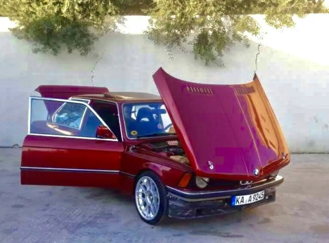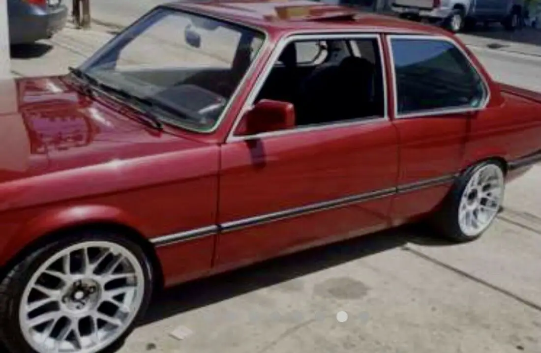 Painted in a beautiful pale red with black trim accents, this car screams classic BMW! Overall the paint is in very good condition with only minor imperfections showing. All of the body panels are very straight, dismissing body work suspensions; however there is a very minor ding on the hood. Outfitted with Alpina front splitter, headlights, mud flaps, BBS basket weave wheels, and a BBS rear spoiler this car distinguishes its’ self from normal 320i’s. These additions are extremely rare an even more rare to be found in such excellent condition as well.