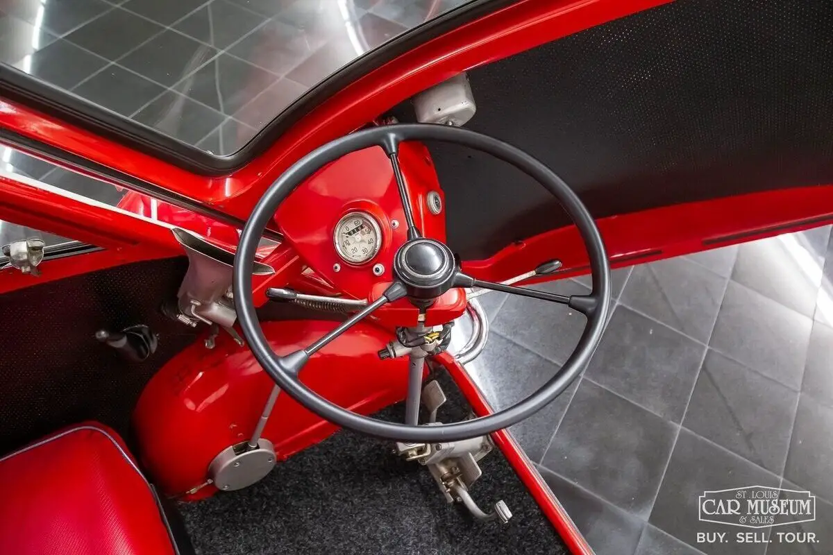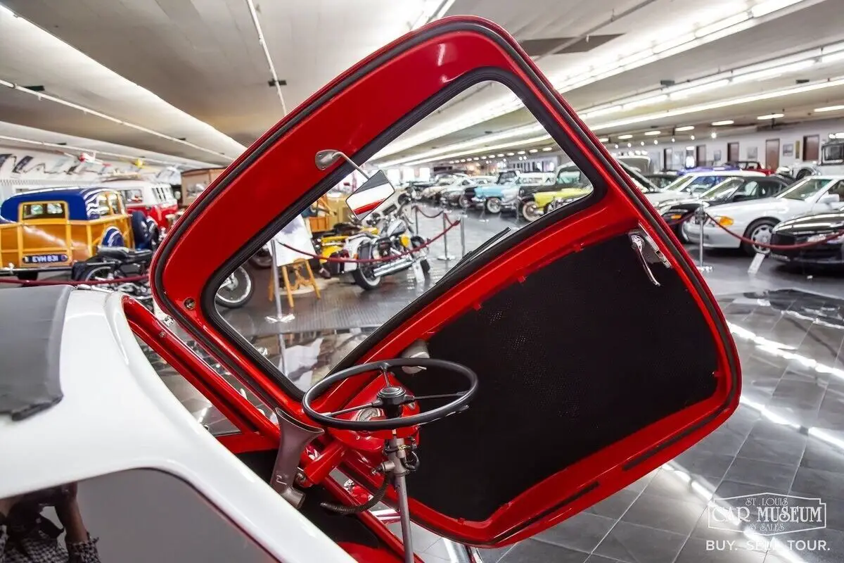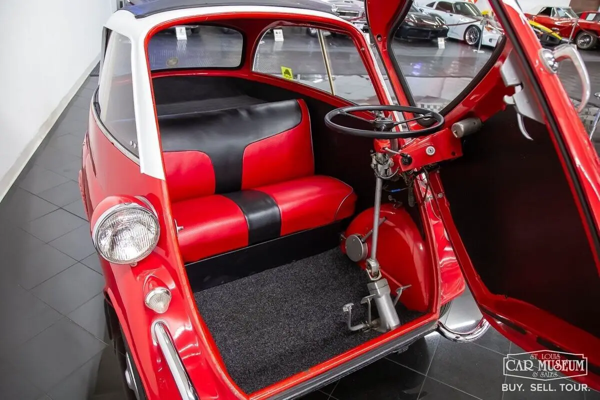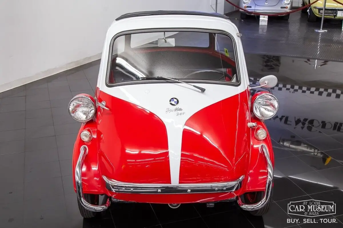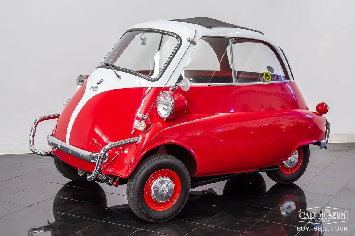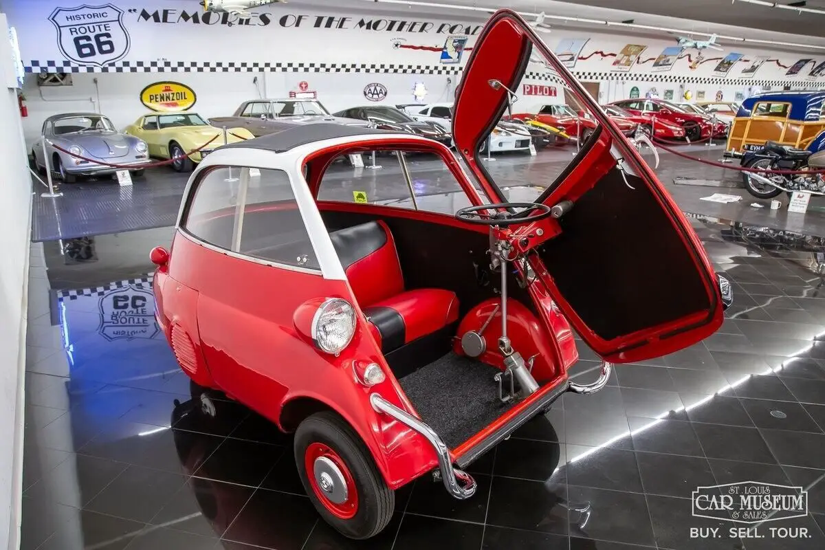 The origins of the Isetta began with the Italian firm Iso SpA who in the early 1950s were building refrigerators, motor scooters, and small three-wheeled trucks. The owner of the company Renzo Rivolta made up his mind to focus efforts on building a small car for mass distribution. In 1952 his dream began to take form with a small car that used the existing engine of a motorbike they built called the Iso Motto 200 and with that the Isetta was born. The first microcar prototypes had only one rear wheel but later changed because the 3-wheel design was more prone to rolling over. With its bubble-like windows and overall egg shape it became known as a bubble car, a name also given to other similar vehicles. Rivolta understood the need for a cheap compact town car and with the introduction of his Isetta he began selling the licensing to several different countries including Argentina, Brazil, Spain, Belgium, France, Germany, and the United Kingdom. Renzo was proud of what he helped create and in 1954 he entered several Isettas into the legendary Mille Miglia where they all were awarded the top three spots in the economy classification. BMW took notice of this microcar and began talks soon after in mid-1954 and bought not just a license to manufacture but the complete Isetta body tooling as well. The first BMW Isetta came to life in April 1955 and was the world's first mass produced car to achieve a fuel consumption of 78 MPG. 1956 was the first full year of production and BMW sold 22,000 Isettas, and as the microcar caught on with popularity, BMW saw the opportunity to improve upon its design. The engine was upgraded to a 298-cc four-stroke single cylinder capable of 13hp and 50 mpg at 50 mph. BMW continued their design improvements in late-1956 and the Isetta saw its bubble windows replaced with longer, sliding side windows to help reduce the fishbowl effect of sun shining on the windows. By 1962, BMW had built 161,728 Isettas making it the top-selling, single-cylinder vehicle in the world! We are excited to offer our 1958 BMW Isetta 300 with its original 298-cc four stroke engine that produces 13hp to the rear wheels and is paired with a 4-speed manual transmission with reverse. Features a unique Dynastart system which incorporated a compact starter and generator into one unit. A rare microcar with its iconic hinged center front door with connected steering wheel that leads to the single seat large enough for 2 and with a cargo area that also holds the spare tire. A left-hand drive with the gear shifter, choke controls, and emergency brake all located on the left side for easy access. The sunroof can be retracted and provides a more spacious, convertible-like feel when out on the road on summer days! And the Isetta's easy sliding windows provide some fresh air in the cabin, and a heater/defrost system allow for cooler weather enjoyment as well. This Isetta was refinished in a period correct Red and White color combination with a two-tone red and black vinyl interior. Featuring a black cloth sunroof, heater, windshield defroster, 10" steel wheels with chrome hubcaps wrapped in BF Goodrich Silvertown tires. Since its arrival at our museum, we have replaced the battery, rubber shift boot, upper & lower engine mounts and changed the engine oil, transmission fluid, and chain case oil. One of only 3,925 U.S. models produced for 1958 and we are very pleased to showcase this BMW Isetta 300 that is sure to be the star of any show and grab attention anytime it is out. Thank you for your interest and please feel free to contact us regarding this rare piece of BMW microcar history!