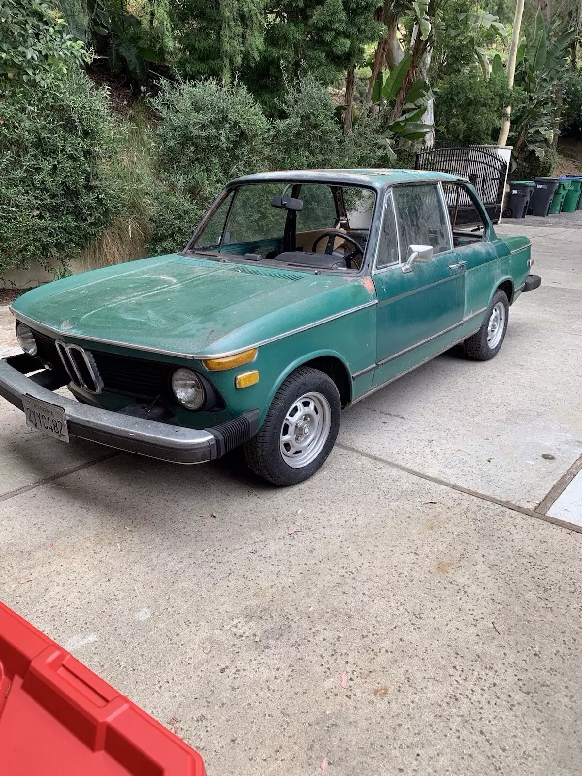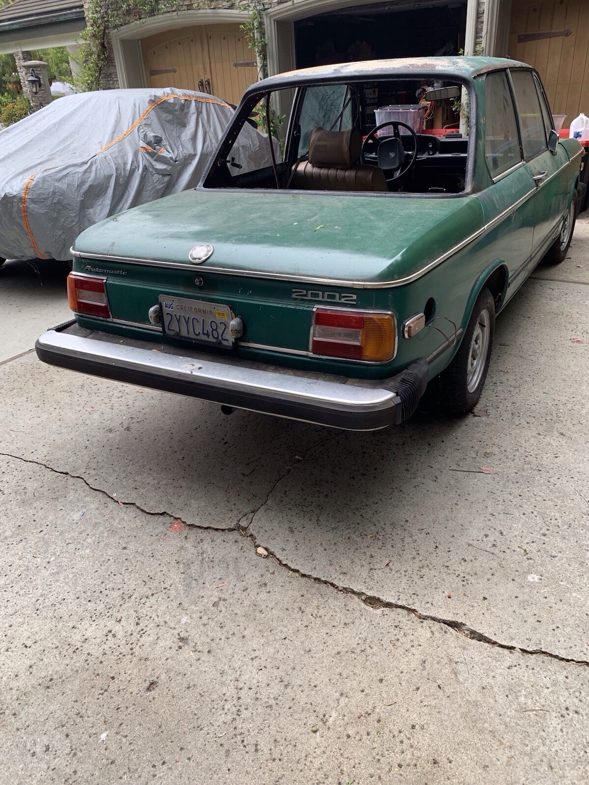 BMW 2002 1975 green on tan. Purchased as a restoration project for retirement hobby on a whim. Painted wheels installed new tires and new Weber carb upgrade. Changed fluids and got it running properly. Moved on to body paint and interior restoration and hit 2 walls. 1 there is a lot more than I have time to fix. 2 I have to move from California to Georgia next month and have no time to complete it and storage is an issue at new house. Honestly more of a parts car than anything else specially at my time in life and move date approaching!I have the seats in pieces a spare drivers door,spare, trunk lid and sunroof roof cut off another car. Gas tank is out I’m preparation for welding. Also have rear window with defrost and rear side window(note must rust is around front and rear windscreens and pass floor which has a new patch panel ready to weld inWill sell to highest offer,Just added pics of shock towers and motor,