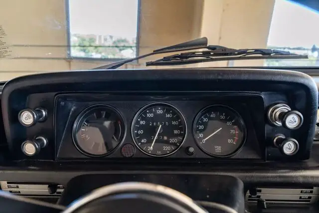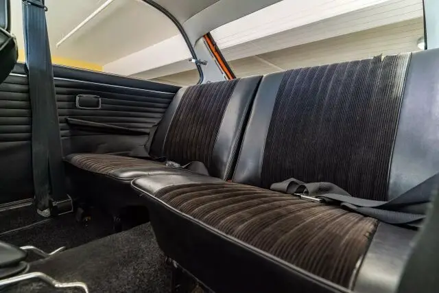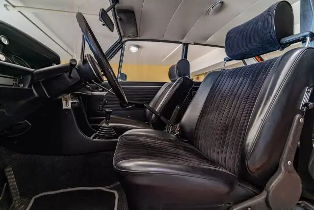 The interior features seating surfaces upholstered in black vinyl with color-coordinated velour inserts in addition to three-point seat belts, a heater, a cargo cover, and black floor mats with contrasting piping. The manufacturer's literature, import documents and a repair handbook are available and come with the vehicle.