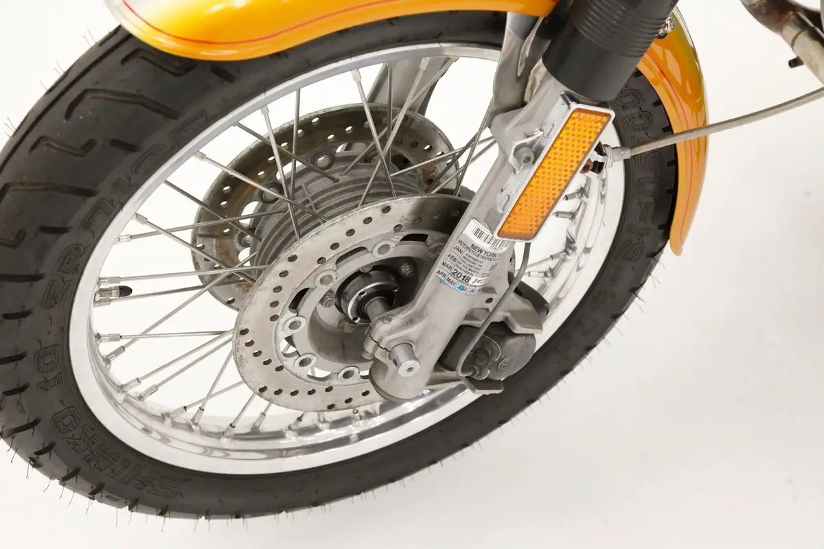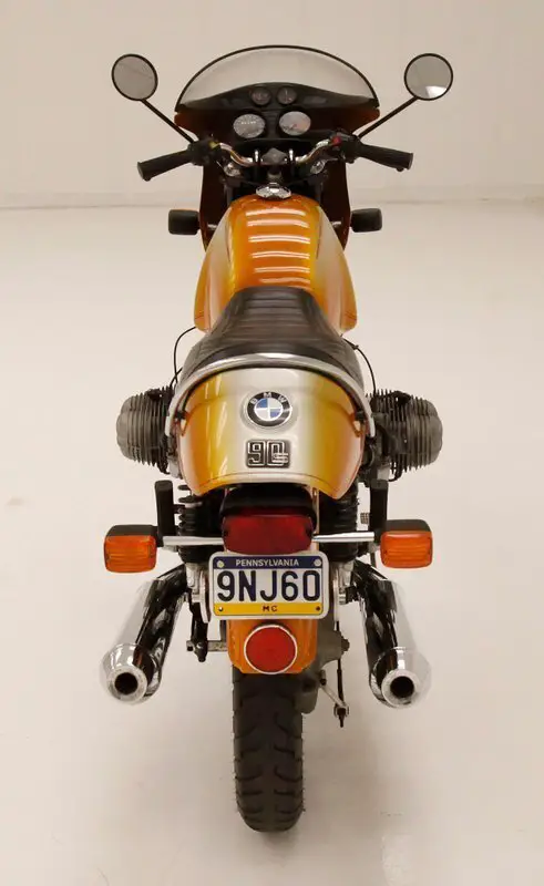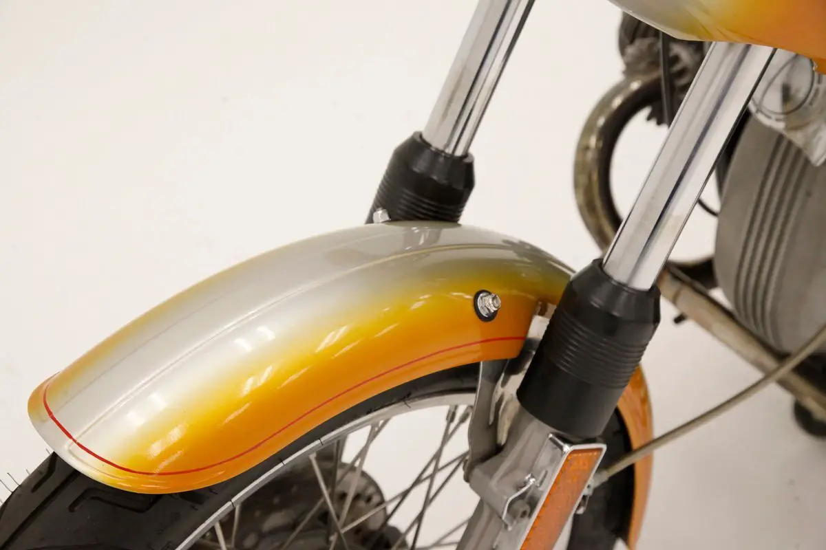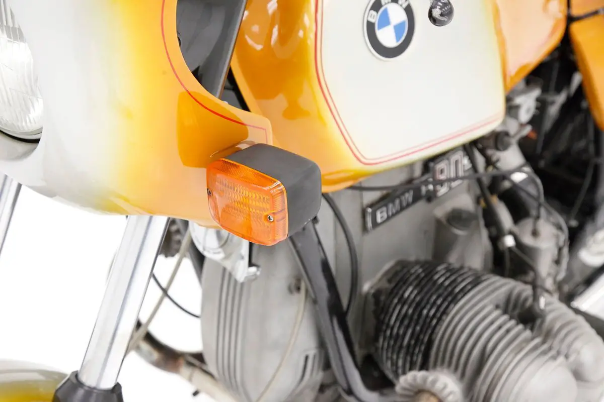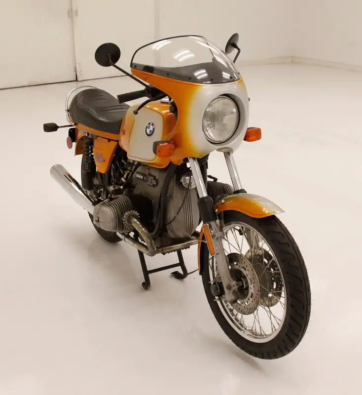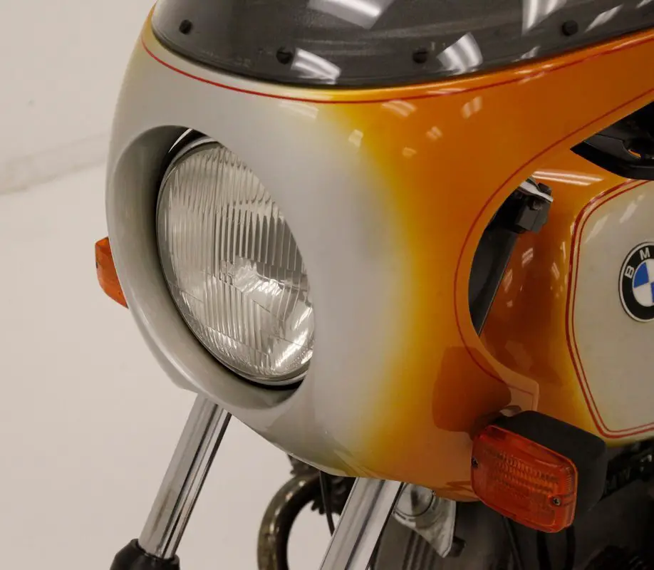 Starting off we spot the most noticeable design inthe S's bikini fairing and the rounded, aerodynamic tailpiece behind the seat that featured a BMW roundel logo. Speaking of the seat, it has the extended package handlebar should you decide to pick up some evening refreshments on your ride. For this 1975 model year, an even more spectacular two-tone treatment is draping the body in Daytona Orange, which includes a sunburst pattern on the tank and red pin striping all around. This paint and striping is all done to factory spec and presents with nary a flaw or fault. We also note a new windshield and mirrors as well. The finish was the sort of "look at me" design that marked an even bigger step outside of BMW's regular territory. Beyond the paint job, the bodywork-from the small fairing to the cowl-like piece behind the seat-was admired and copied throughout the industry in the coming years by everyone from Suzuki to Harley-Davidson.
