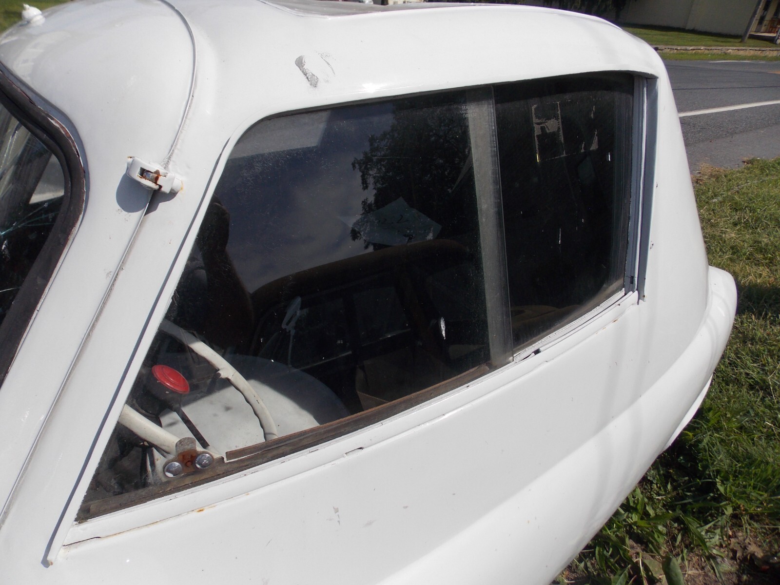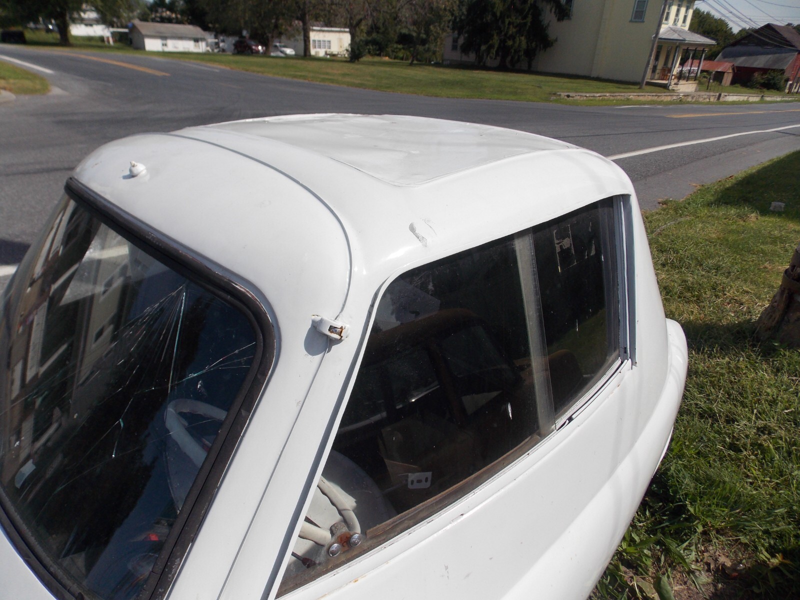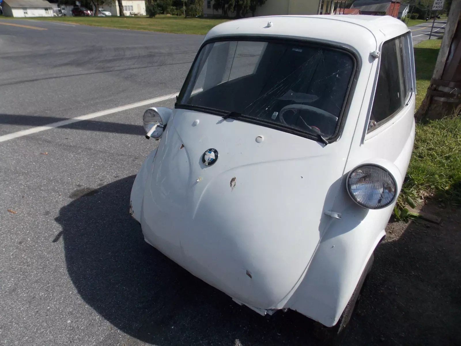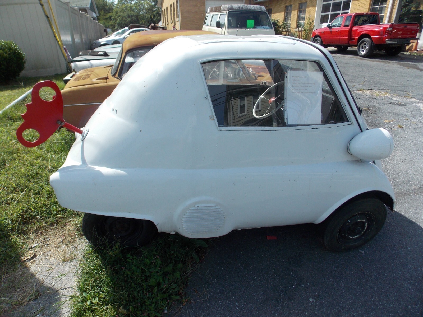1957 BMW Isetta 300, CabrioletThe Sunroof opening and Back Glass/Soft Top have been covered with metal. The car was used as a sign on top of a pole. The body is solid and the panels to cover the sunroof and back glass can easily be removed.There is steel framework under the floor for the sign mount. This was well built and can be removed without cutting into the body. It is painted White. Side Glass is in the car, Windshield is broken.The trans is in place. The engine is apart in boxes and will need a complete rebuiltThis is a good solid body. The covers over the sunroof and back window can be removed without cutting into the body.