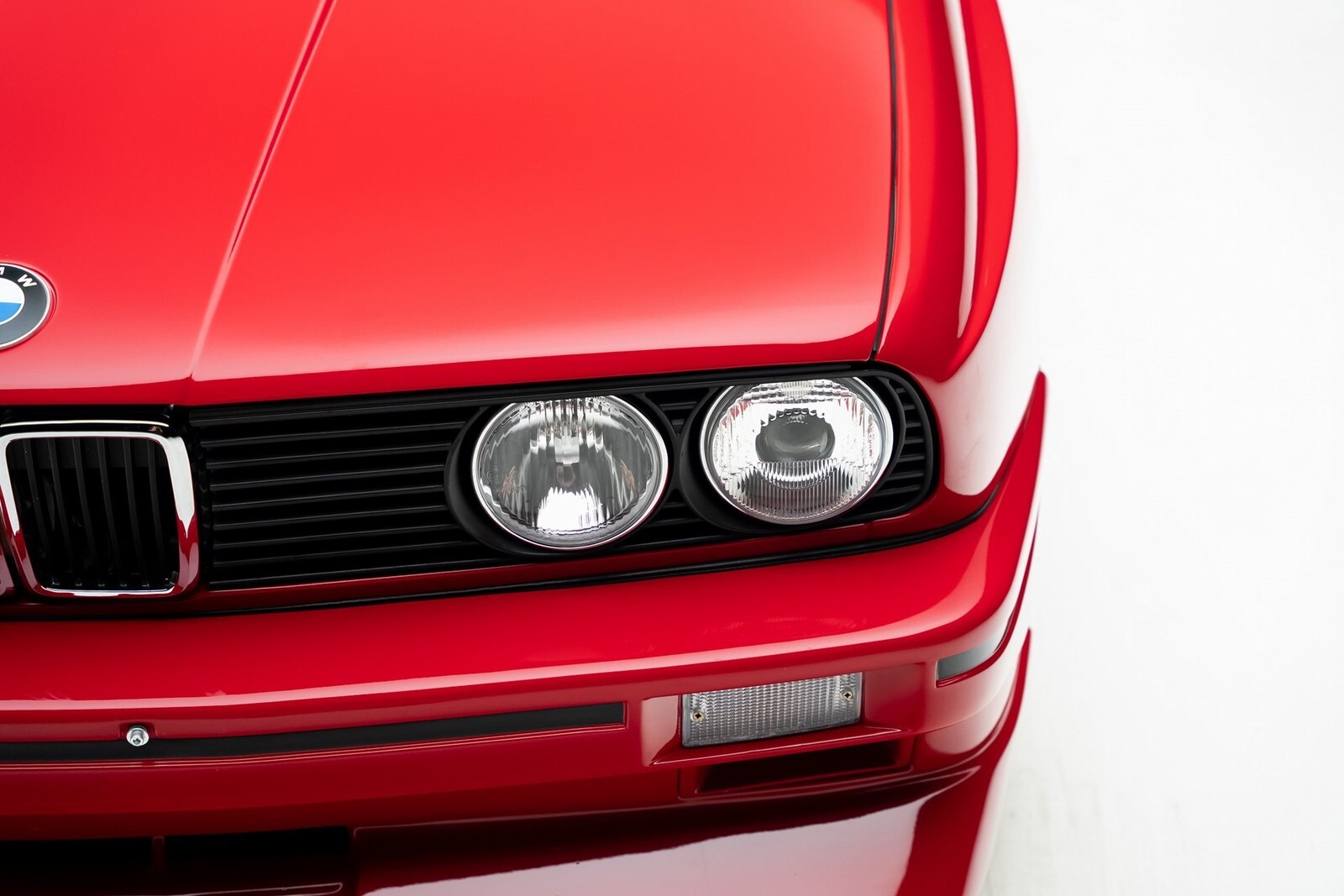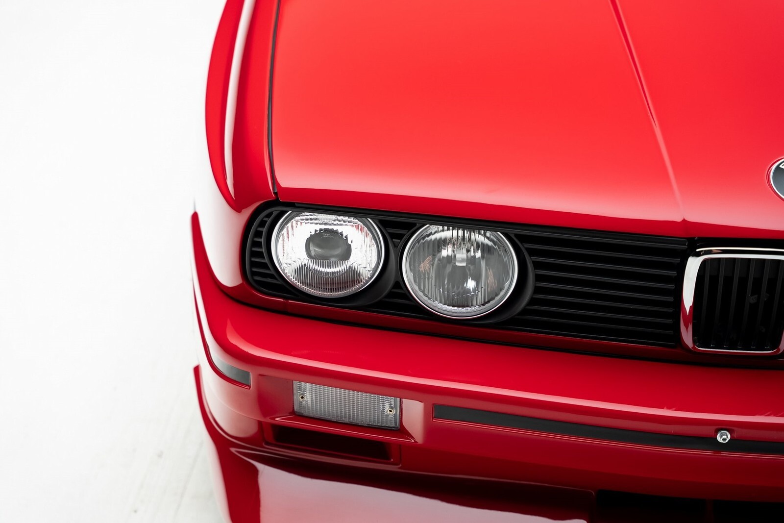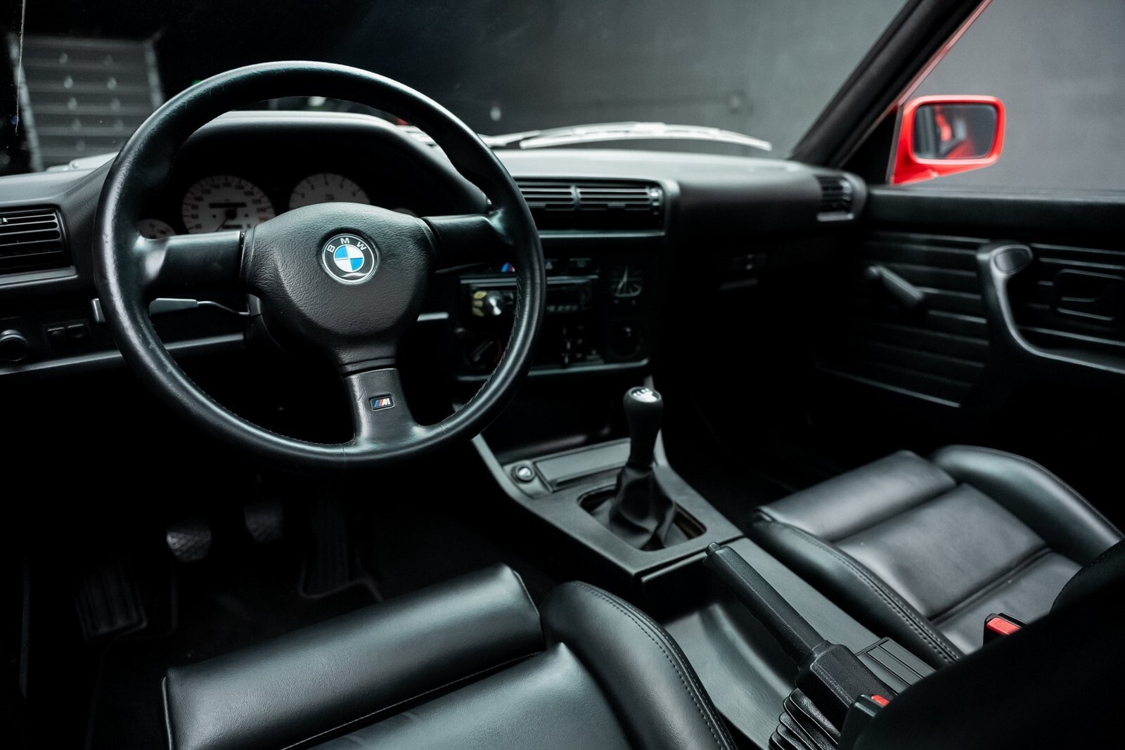 Interior: E30 M3 front and rear seats, black leather upholstery, M Tech II steering wheel, red seatbelts, and replacement headliner/carpeting.