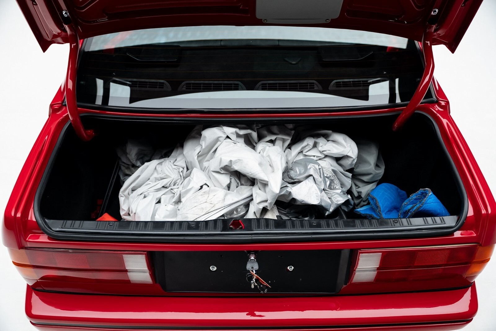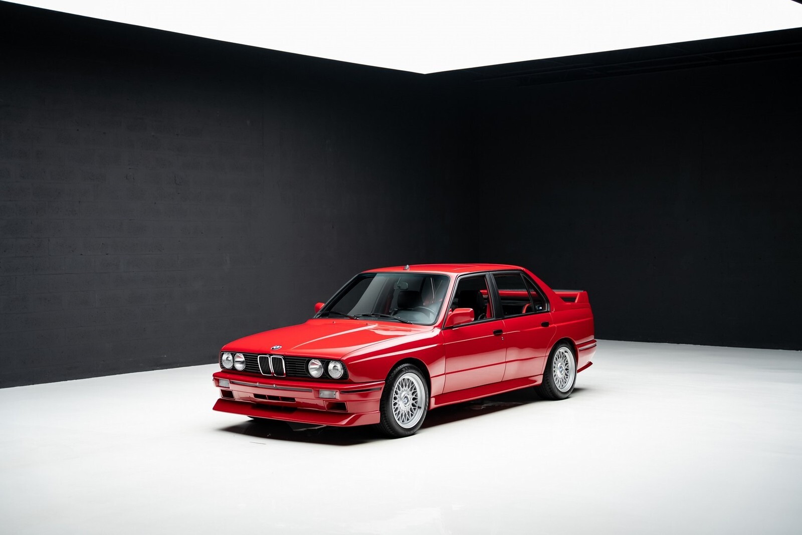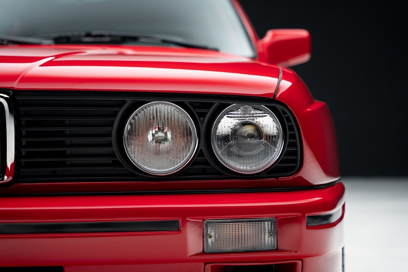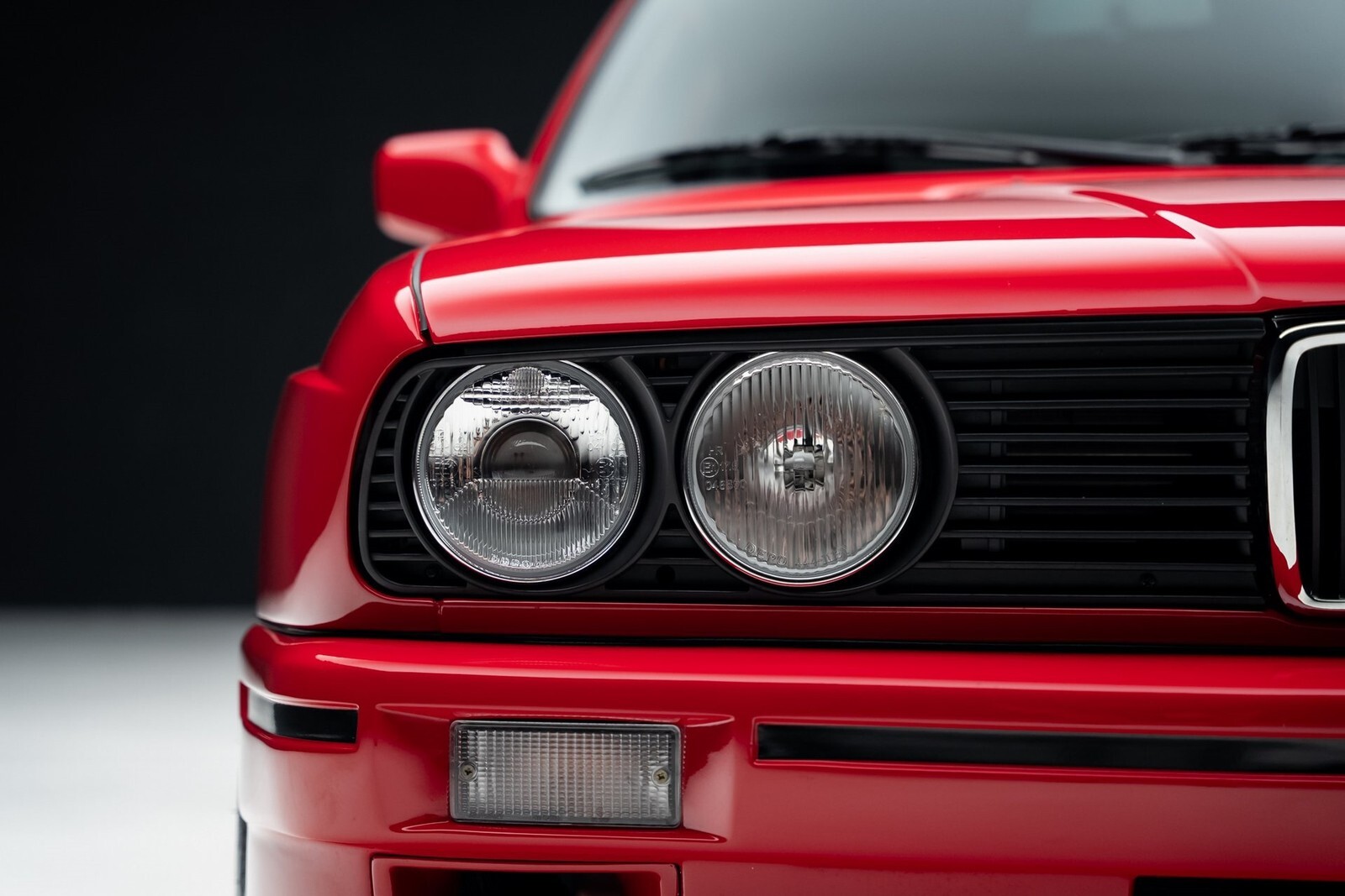 Interior: E30 M3 front and rear seats, black leather upholstery, M Tech II steering wheel, red seatbelts, and replacement headliner/carpeting.