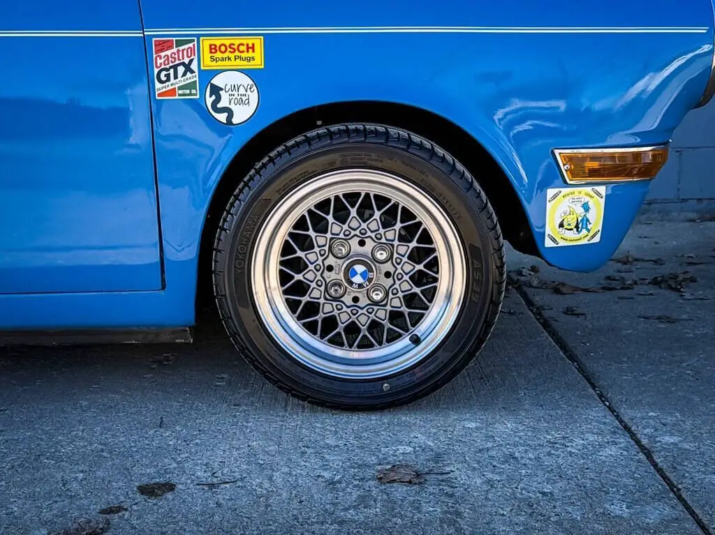 The body and chassis are solid and in good condition. Suspension features Koni coilovers, Delrin bushings, and a rear sway bar. Drum brakes are fitted at all four corners. The car rides on 13'' Basketweave wheels wrapped in new Yokohama tires.