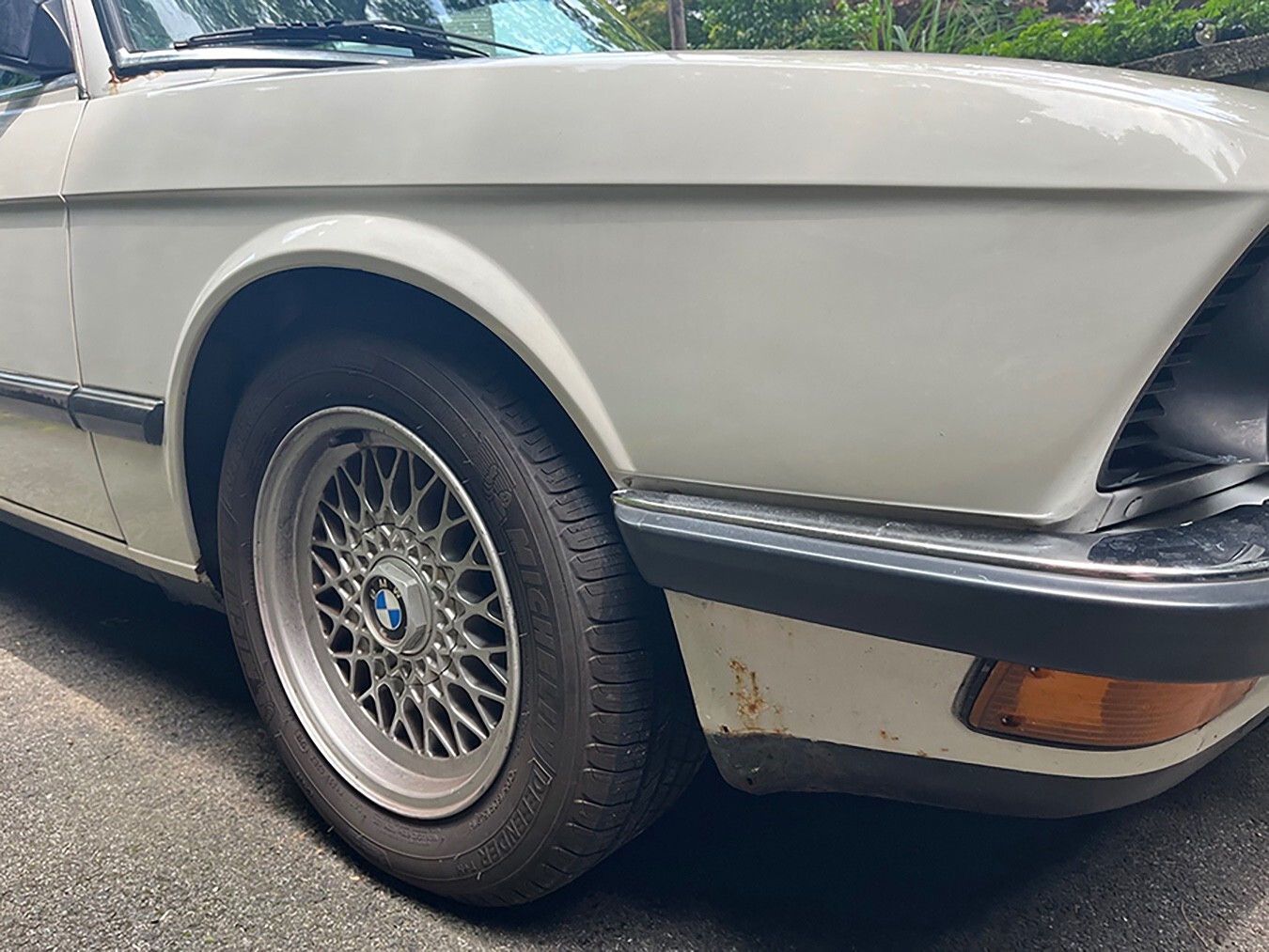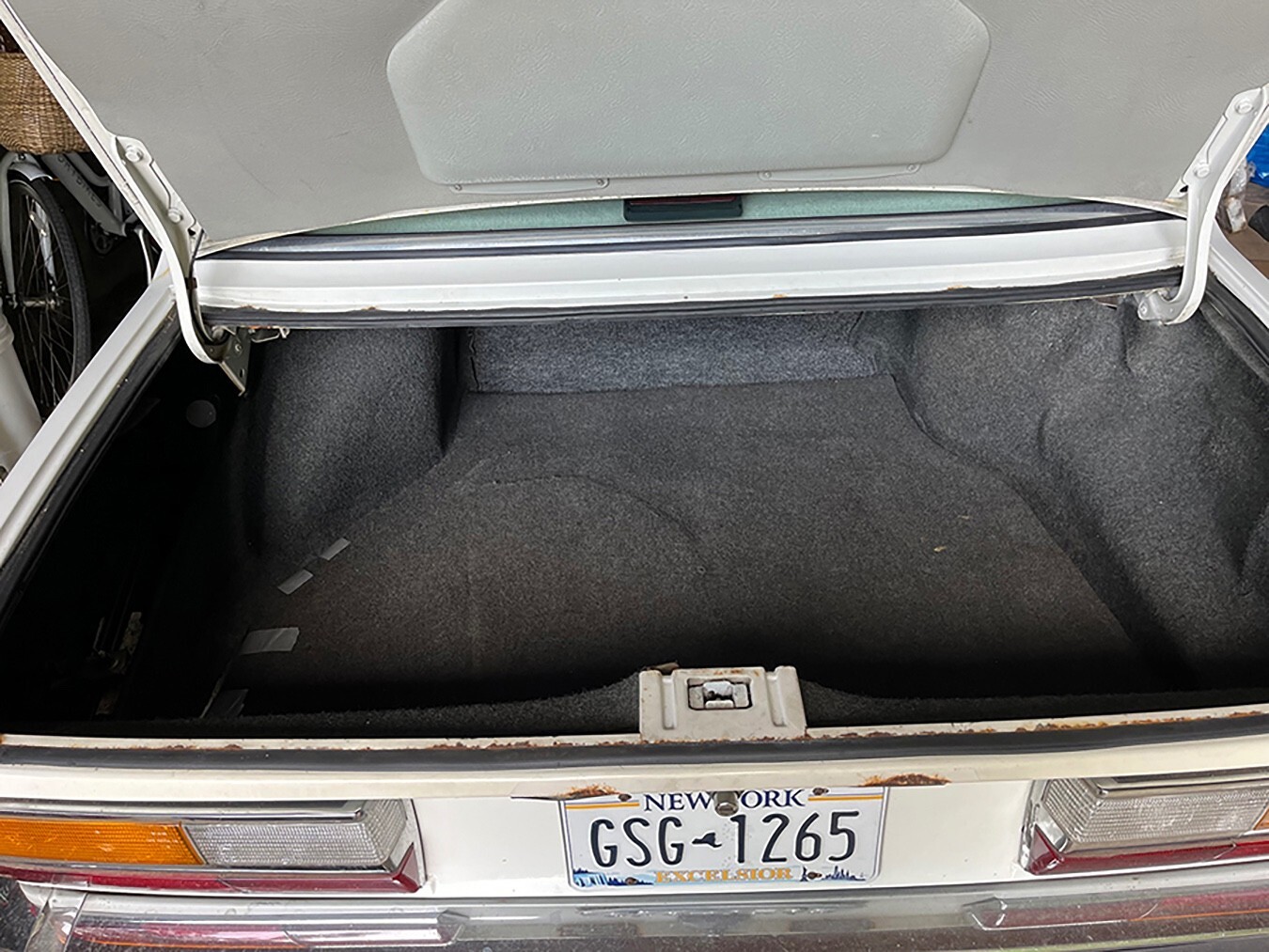 The exterior is finished in Alpine White with chrome trim and basket weave wheels wrapped in Michelin 17" tires. It has quad headlights with fog lights with chrome-accented Euro bumpers and dual exhaust outlets. Rust spots on the rear trunk edges above license plate, window corners, and under wheel wells is the only thing someone can point for possible fix. The front left fender had minor surface damaged by someone backing into it, and was changed, and the paint job was not matched properly to the car and I never got around to fixing the rust spots andaddressingthe paint.