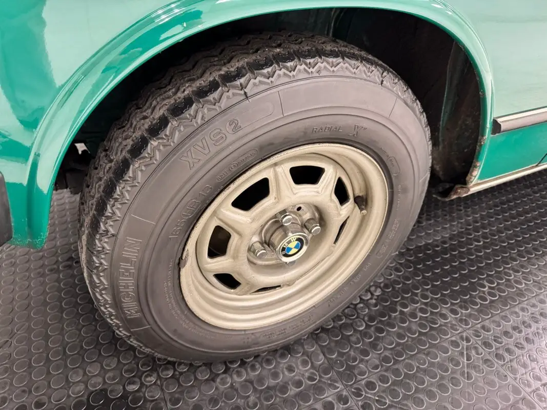 The inside steps things up a notch with near flawless tan vinyl door panels, elegant in their simplicity and flatness. Vinyl seats with cloth inserts, buckets in front and a bench in the back, both in very nice condition. A four spoke steering wheel with horn button on each fronts an attractive instrument cluster based in a wood applique face plate and including a clock in the arrangement while clean black surfaces cover the rest of the dash and the center stack which house a Blaupunkt AM/FM/Cassette radio. At your right hand, you'll find a T-shifter with some oxidation on the shaft and some tarnish on the metal on a clean, grain vinyl base. Tan carpet presents nicely on the floor with BMW branded cocoa mats there for protection and the light colored headliner is smooth and clean around a sunroof and similar conditions are noted in the trunk where a spare is housed in a recessed section.