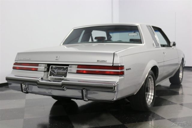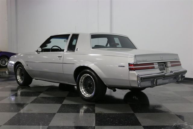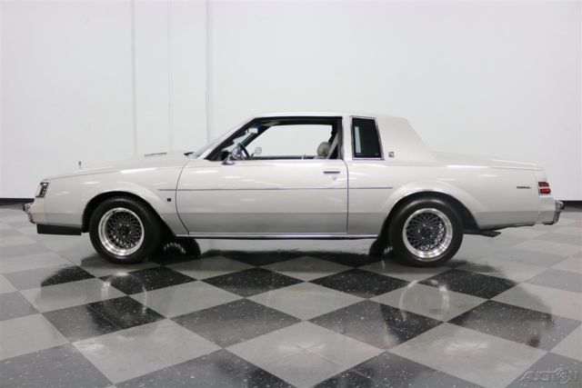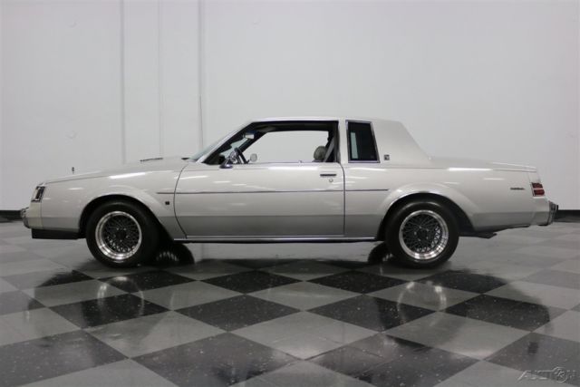If you're a car guy, I don't care what you drive, you know better than to mess with the big, bad, blown Buicks. Right out of the box, these cars were potent enough to give contemporary Corvettes a good run for their money, and even today, smart car guys know that these cars can pack a serious wallop. This extremely clean code J47 coupe 1987 T-Type is NOT a more common Grand National, but rather a Regal Turbo-T which is a far more subtle and rare, and therefore a more fearsome and unique beast. Man, this thing looks awesome in silver, doesn't it? The icy cold paint and liberal use of chrome work extremely well on this low-mileage (21,577 actual!) Buick. We almost prefer this look to the all-black finish the Grand Nationals usually sport, and it's considerably less common. Nicely preserved, it's a sure bet that this car was never used for the daily grind, and there are few signs of use anywhere on the car. The dome on the hood was functional, helping to clear the intake duct that feeds the engine, but otherwise it's just a padded roof away from being a clone of grandma's luxury barge, making it a brilliant sleeper. The chrome that remains is in excellent condition, reminding you that this is still a luxury car on the inside. That little "T" (package code Y56) badge on the front fenders is a real indication that this car is something special, but by the time you notice it, it's probably already too late. Add in the front and rear aluminum bumper brackets (codes VD6 & VD7), and you'll know you've just been passed by a rare bird. Inside, you won't forget that you're driving a Buick, as every luxury and convenience item was standard equipment. The gray fabric upholstery is grippy enough for spirited driving and has held up well over the years. Blue-gray carpets add some welcome contrast, and they're in good shape with only minor signs of use. The standard Regal's instrument panel left a lot to be desired in a performance car, so Buick engineers stuffed a tiny bar-graph style tachometer in the corner, and the owner has wisely added Auto Meter boost and oil pressure gauges under the dash, just next to the special controller for the ECU. The original 1987 Delco AM/FM/cassette stereo remains in the dash, and it still carries all the luxury features you'd expect, including power windows and locks, A/C, cruise control, a tilt steering column, and a center console. The trunk looks almost completely unused, with original mats and a space-saver spare that's never been down. While the stock turbo Buicks were potent, this one is downright threatening. The beefy 3.8 liter V6 has been augmented by a custom computer program, ram air intake, and alcohol injection, which makes this car explosive at any speed, in any gear. On the other hand, the mods are pretty easy to reverse (why would you want to, though?) so if you want bone stock, it's easy and the original parts come with the car. The quick-shifting 2004R 4-speed automatic is a great partner, allowing you to keep both hands on the wheel while your foot is flat on the floor and with 3.42 gears out back, the V6 is always on its toes. The exhaust has that familiar Buick Turbo sound and the 16-inch 1989 Turbo Trans Am wheels look exactly right, although they kind of give away the car's secret. They've been fitted with 245/50/16 radials all around, but you'll note that the rears are drag radials, so you know this car means business. Complete with all the original parts, including the stock wheels and tires, this is an incredible find for Turbo Buick fans. Call today!