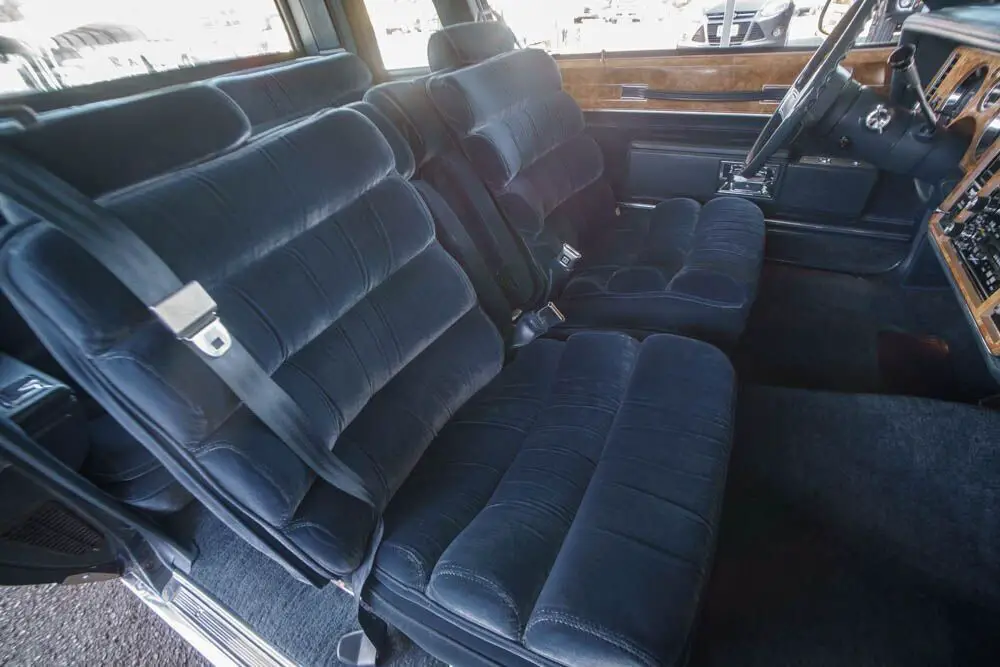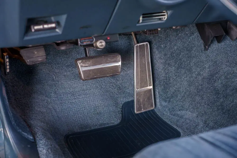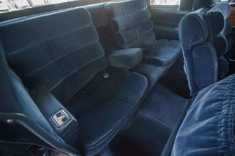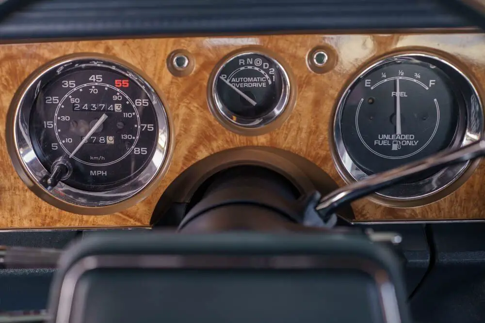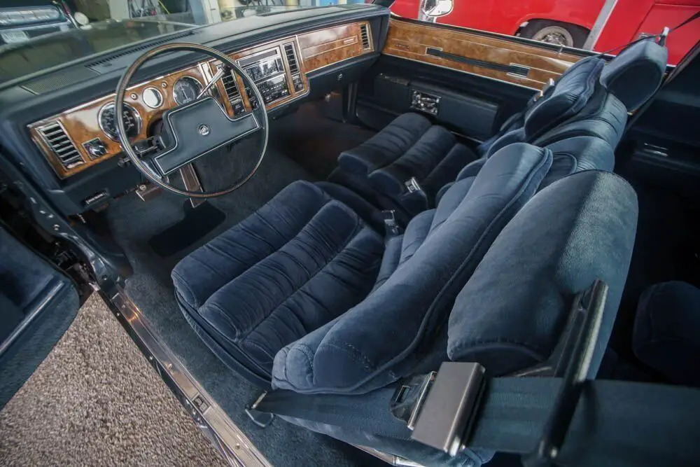 Inside, the Dark Blue cloth upholstery (code 27) looks sumptuous and inviting. The front seat is split 50-50 and has individual fold-down arms for driver and front passenger. The matching carpeting looks great and even the courtesy lights still work after almost 40 years. The headliner looks great, as does the two-spoke deluxe steering wheel (code N32). Faux wood paneling graces the inner door panels and dashboard for touches of warmth and happens to coordinate well with the dark blue. There's an electronic touch climate control panel mounted above a Delco-Bose AM/FM stereo with cassette deck, auto reverse, scan/seek five-band graphic equalizer and metal tape settings. A column-mounted shift lever completes the interior.