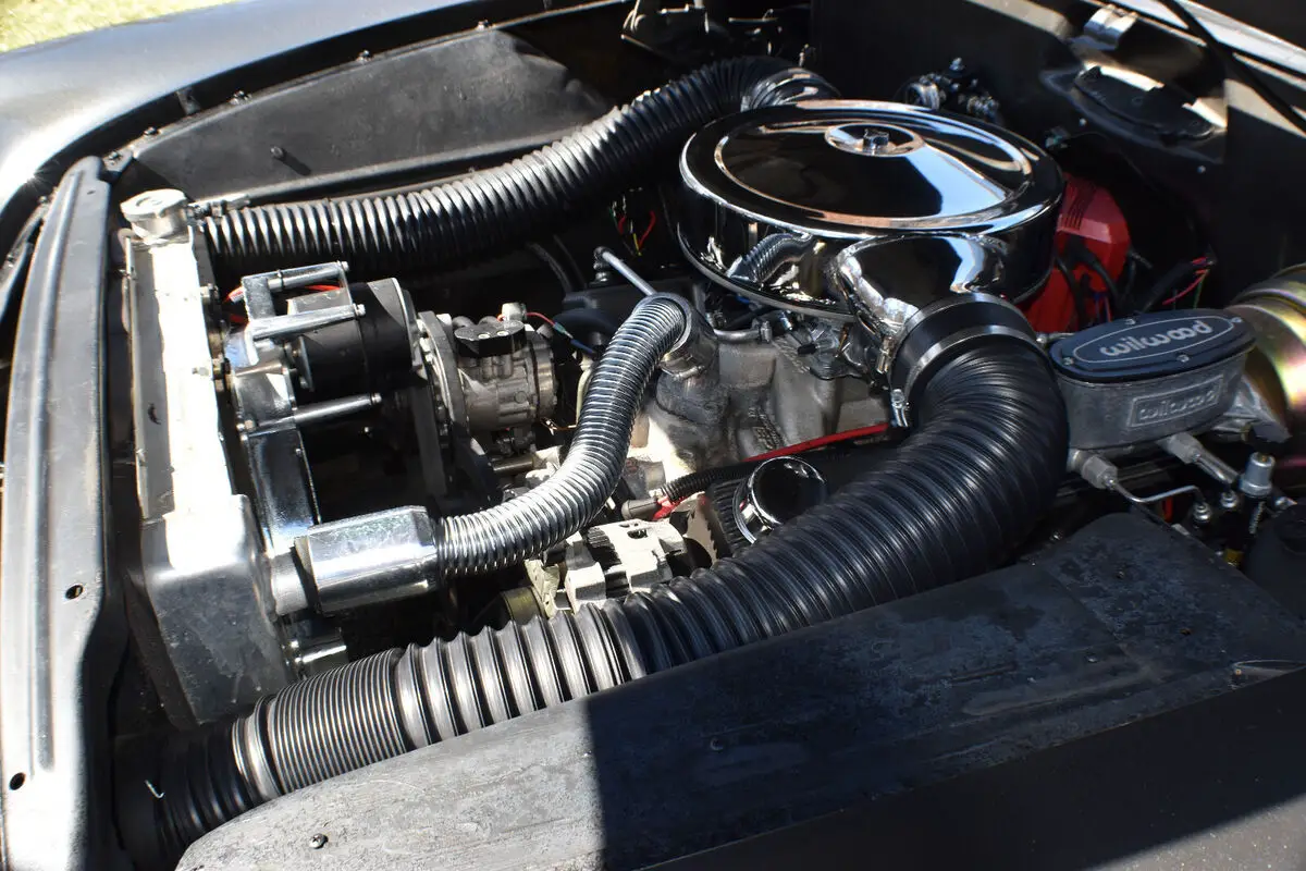 Under the hood is a 350 cu. in crate motor rated at about 300 h.p. and includes an Edelbrock 650 cfm carburetor, Performer EPS intake manifold, HEI ignition, March serpentine belt system, 6-12 amp conversion, custom 17 gallon fuel tank, HD aluminum radiator, 17” Sidewinder fan, vacuum canister, “ram horn” style exhaust manifolds, 2 ¼” dual exhaust with Magna Flow mufflers, ‘ram-air’ air cleaner, and custom valve covers.
