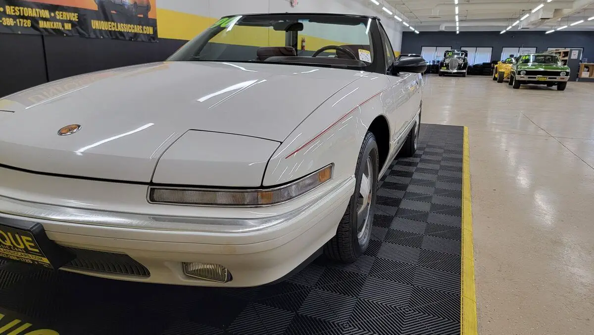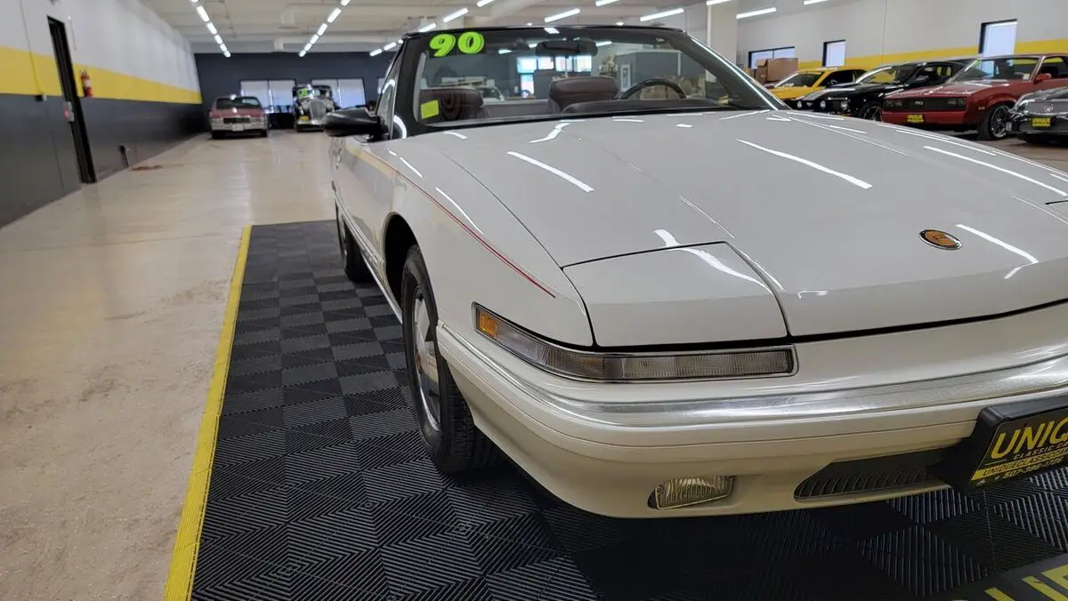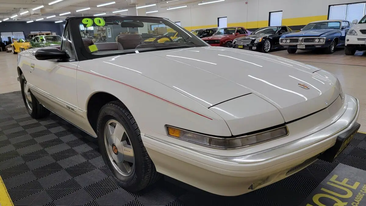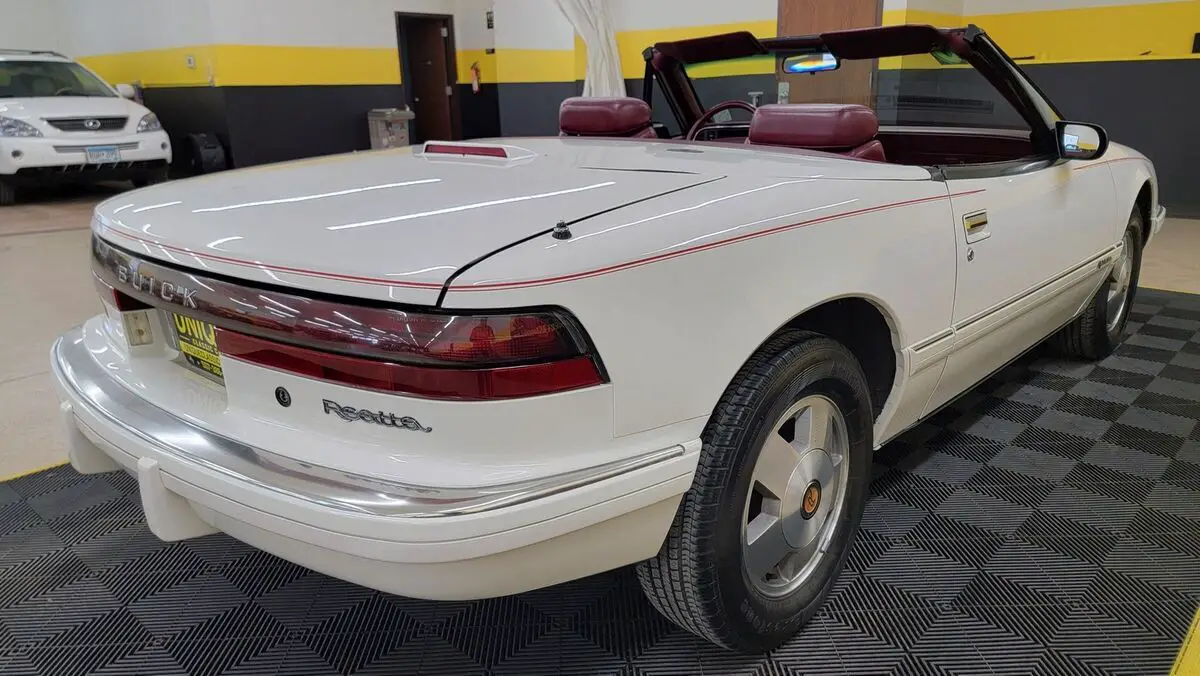 1990 Buick Reatta Convertible in White paint with red pinstripe. This one has a clean carfax, no accidents indicated and 32,881 actual miles! 3800cc V6 (3.8L) under the hood that is paired up with an auto with overdrive transmission. Equipped with power steering, dual power seats, power mirrors, power windows, power locks, power brakes, and a/c. A/C has been converted to R134a but will need some attention. Flip up headlights recently got new motors and are working. Riding on Reatta wheels with Firestone radials. Burgundy leather bucket seat interior with center console. Manual convertible top fits as it should. Brakes are 60% in the front and 90% in the rear. Radio works!