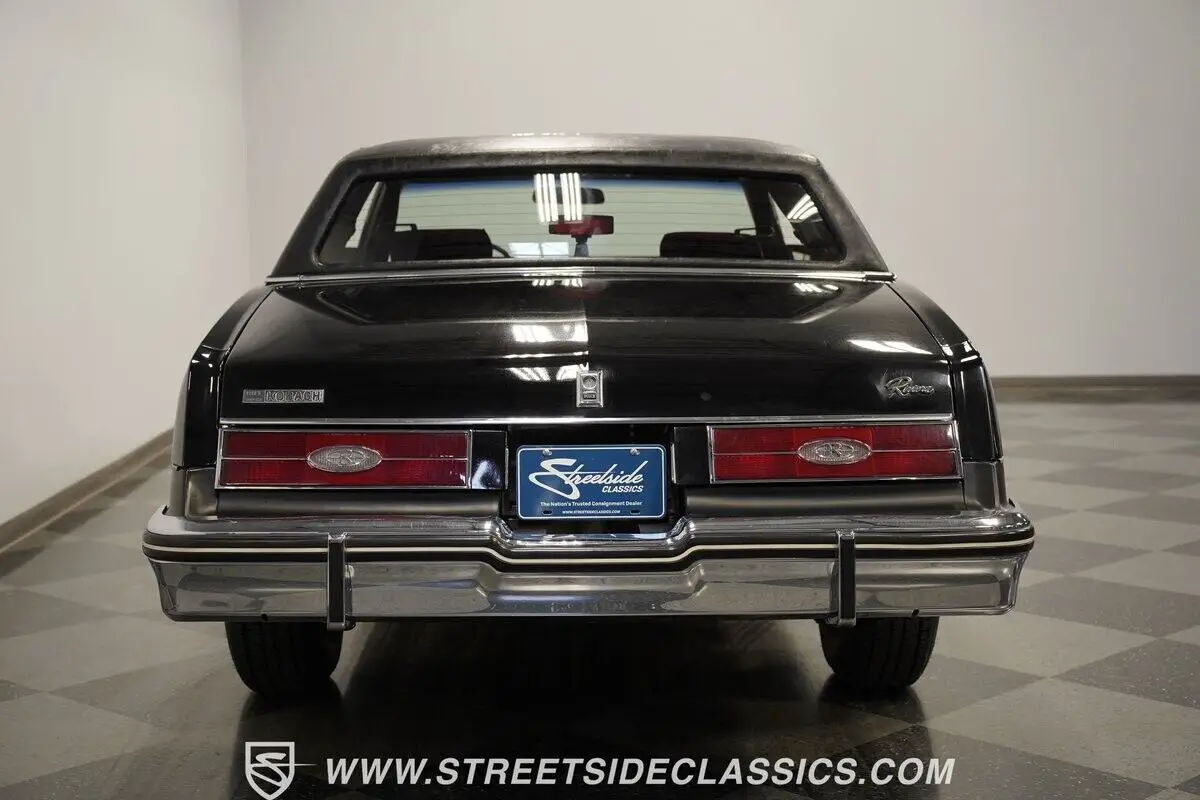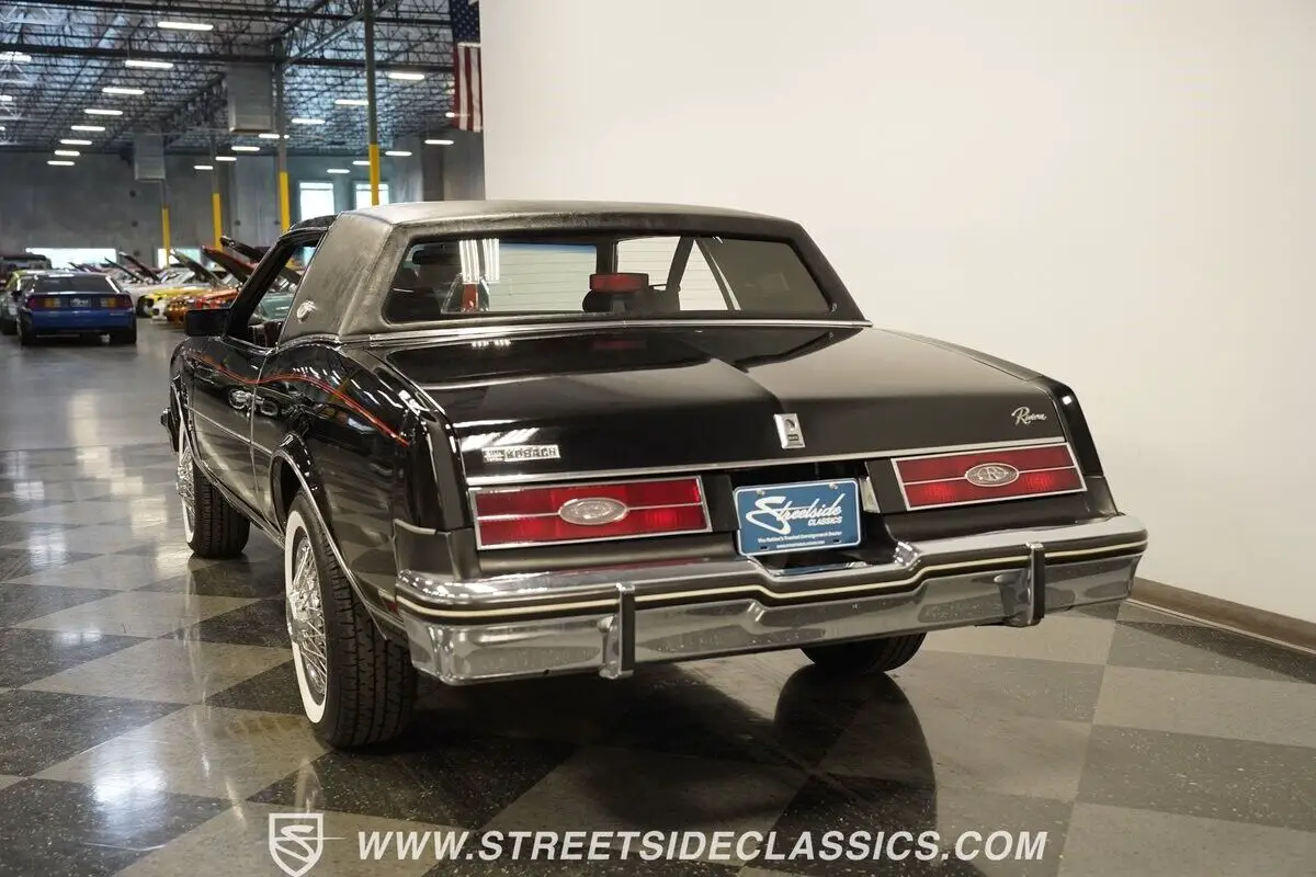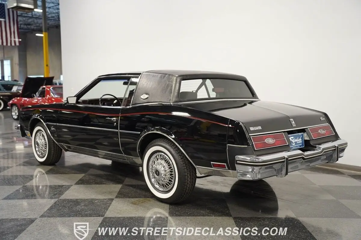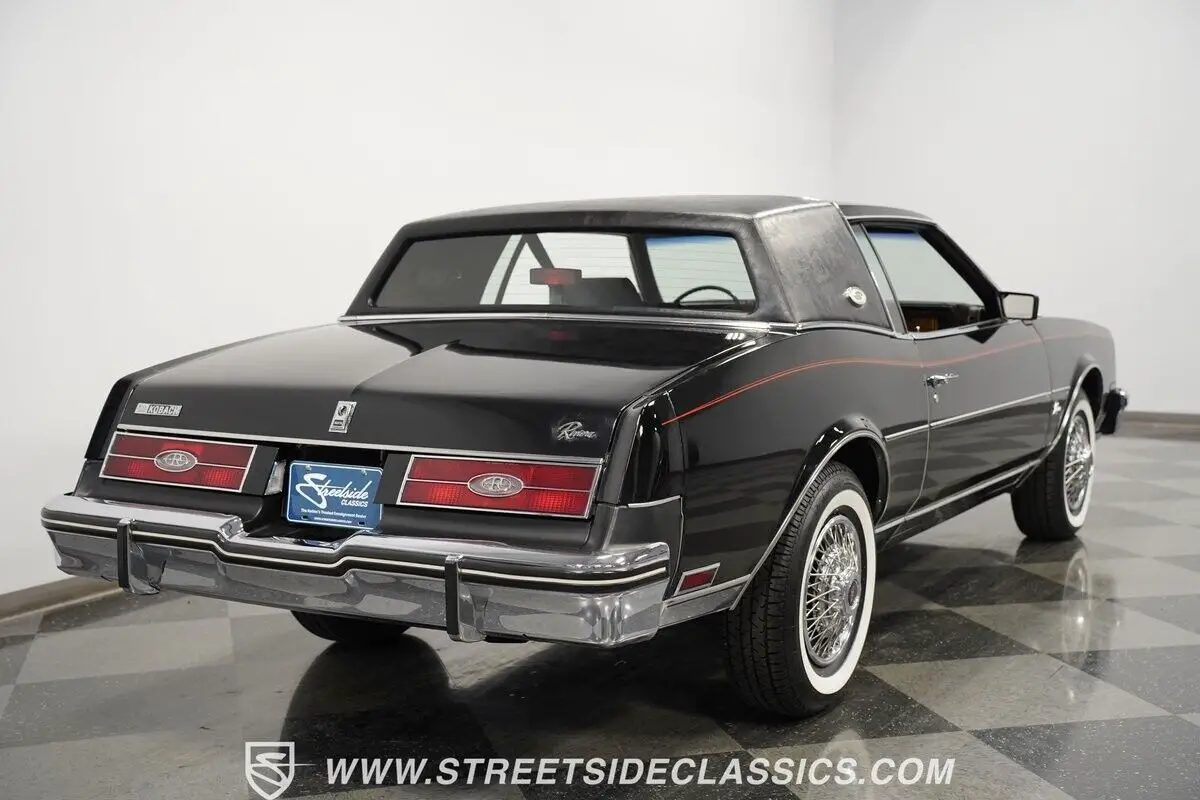 A genuine one-owner masterpiece with only 32,865 actual miles, this 1985 Buick Riviera blends high fashion with advanced technology. The sleek black exterior channels pure eighties opulence, accented by an elegant black half landau top and bold red pinstripes. Advanced for its era, hidden directional lamps illuminate within each front fender during nighttime turns. The refined silhouette rolls on 15-inch steel wheels with deluxe wire covers and 225/75R15 whitewall tires, creating a distinguished road presence.