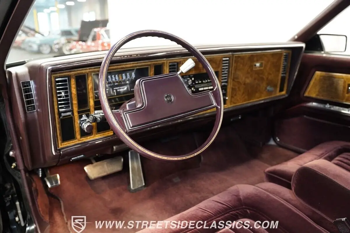 The rich dark red cloth interior radiates pure 80s luxury grandeur. Generous bench seating welcomes occupants into a world of comfort, while authentic wood trim adorns the dashboard with sophisticated detailing. The thoughtfully designed cabin arranges the shifter on the column for effortless control, enhanced by power steering and factory air conditioning. The AM/FM cassette stereo system brings crystal-clear audio entertainment.