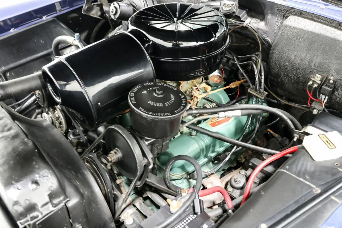Finished in a striking shade of blue, the exterior keeps its classic charm with original hubcaps wrapped in Coker Classic wide whitewalls. Inside, the blue and white interior screams mid-century Americana. The Painless wiring harness keeps things reliable, while Vintage Air underdash A/C brings modern comfort without spoiling the look. Power steering and power brakes add welcome ease behind the wheel.
