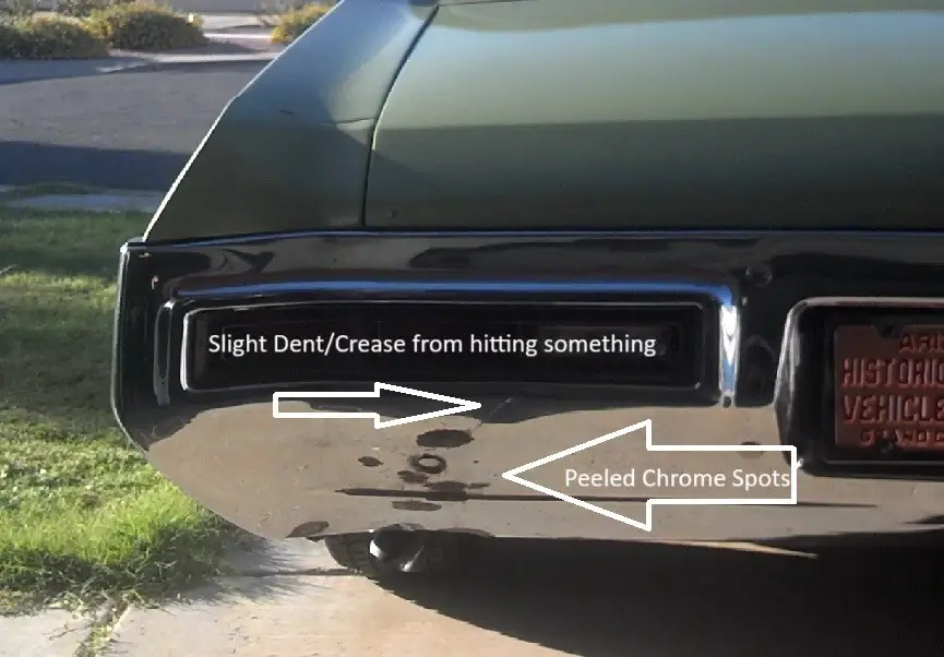 Rear Bumper: Has 1 little ding from something right below left tail light so that needs worked out from a bumper restorer, otherwise is nice, but not perfect. The previous owner had Tack Tape Strips up bumper and removing showed some stripped Chrome Spots on the left side shown in pictures as well behind the flip down license plate there are peeled Chrome areas. The Right Side of bumper is very nice. Also I cleaned tail light buckets and lenses, lined over the faded silver in buckets inside with shiny Aluminum Foil to make the tail lights very nicely bright like new (They look Great and very bright Lit Up Now).
