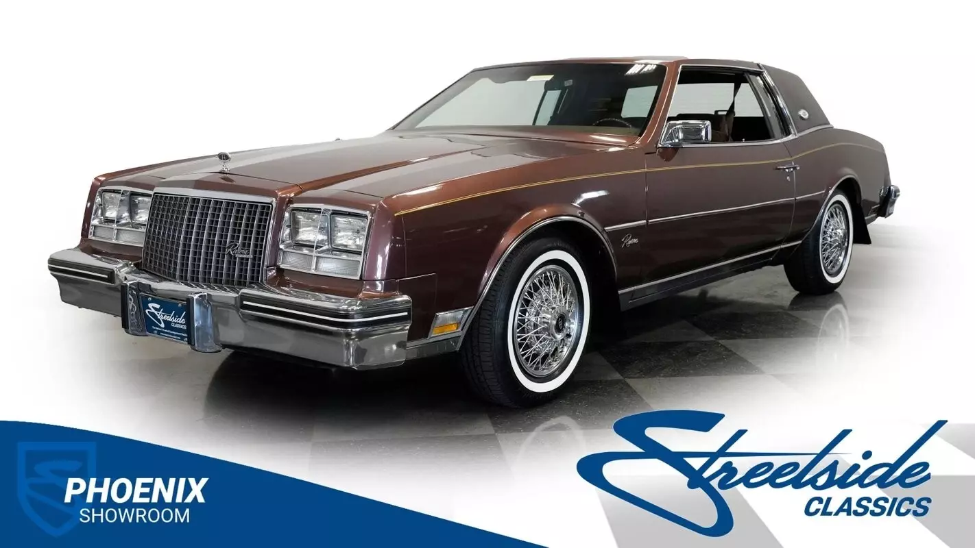 Finished in brown with a matching brown vinyl top, this 1983 Buick Riviera carries its factory styling with clean proportions and crisp detailing. Chrome trim outlines the grille, bumpers, and window surrounds, tying the look together without distraction. It sits on 15-inch steel wheels with wire wheel covers, wrapped in 215/75R15 whitewall tires that complete the original appearance. Every line stays true to the Riviera's design language-confident, composed, and unmistakably Buick.