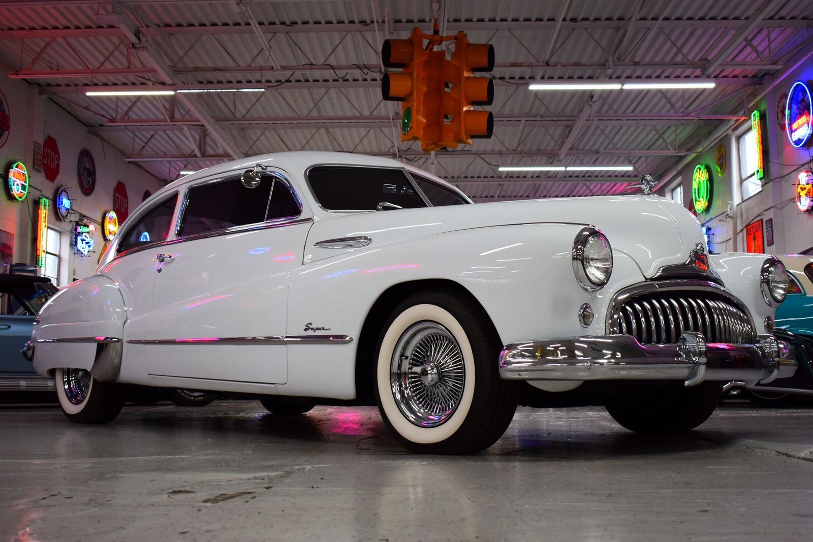 Offered for sale is a stunning 1948 Buick Super 8, finished in bright white and accented with classic wire wheels wrapped in like-new wide whitewall tires. This car presents all the charm of late-40s Buick styling with the reliability and comfort of well-chosen modern upgrades.