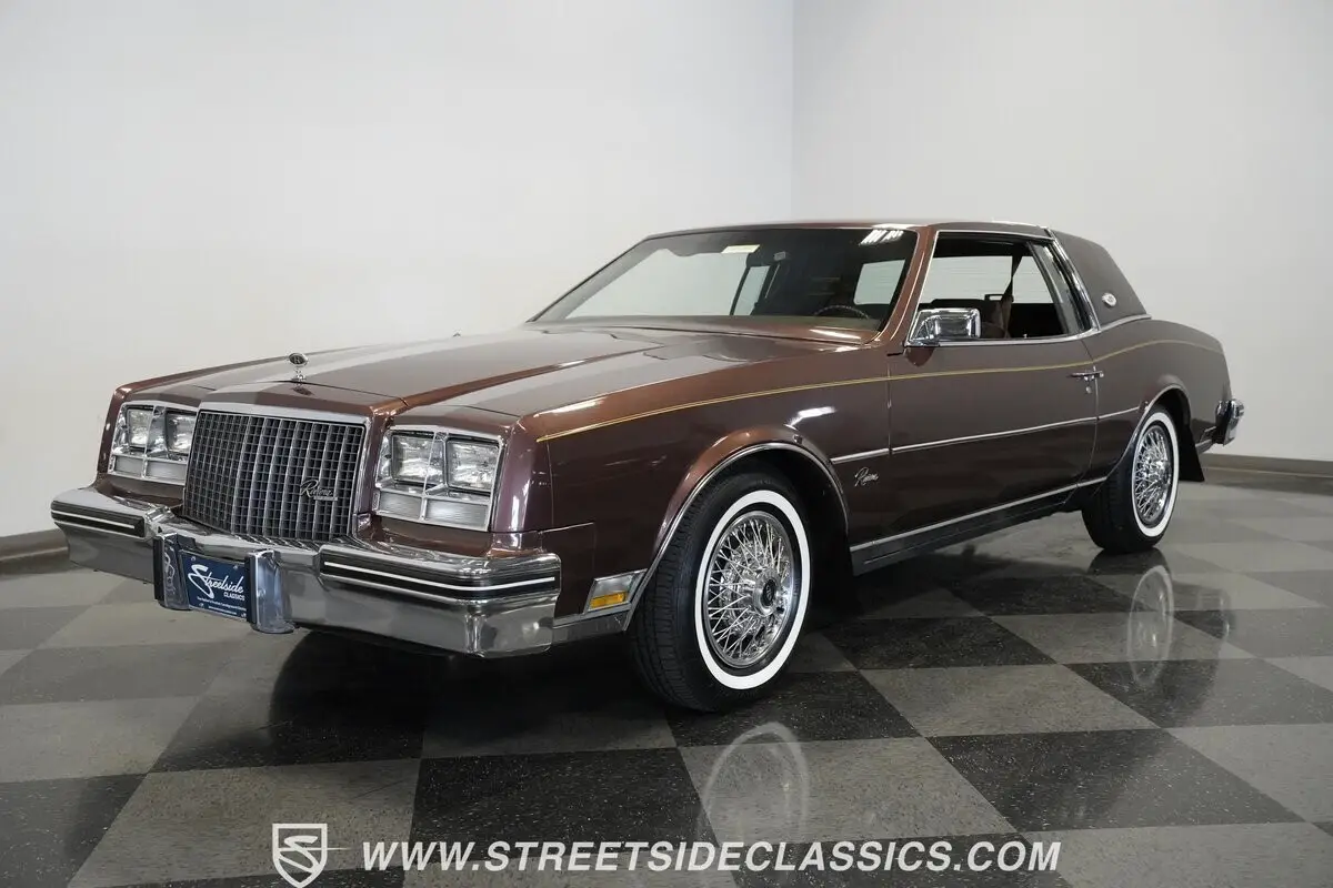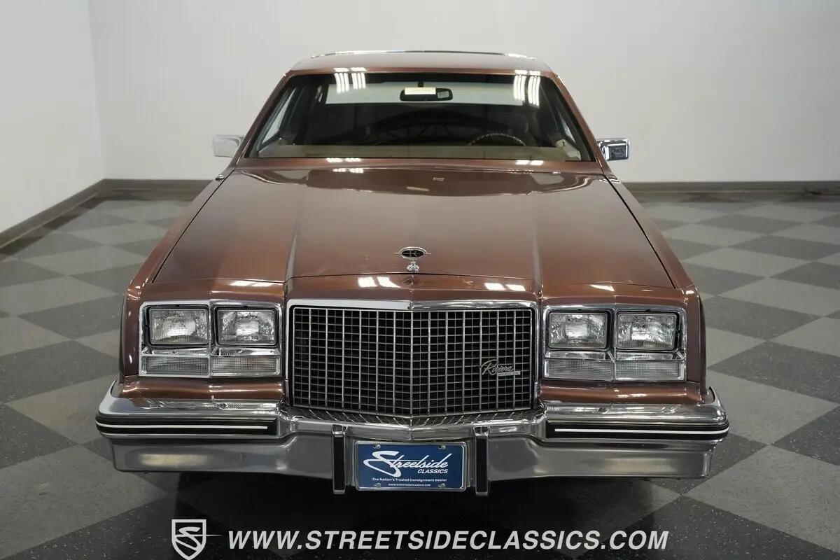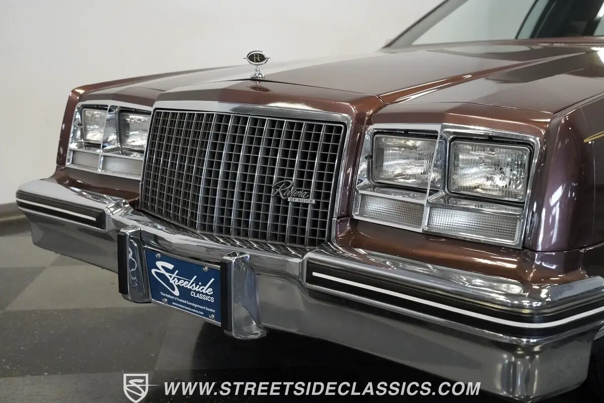Finished in brown with a matching brown vinyl top, this 1983 Buick Riviera carries its factory styling with clean proportions and crisp detailing. Chrome trim outlines the grille, bumpers, and window surrounds, tying the look together without distraction. It sits on 15-inch steel wheels with wire wheel covers, wrapped in 215/75R15 whitewall tires that complete the original appearance. Every line stays true to the Riviera's design language-confident, composed, and unmistakably Buick.